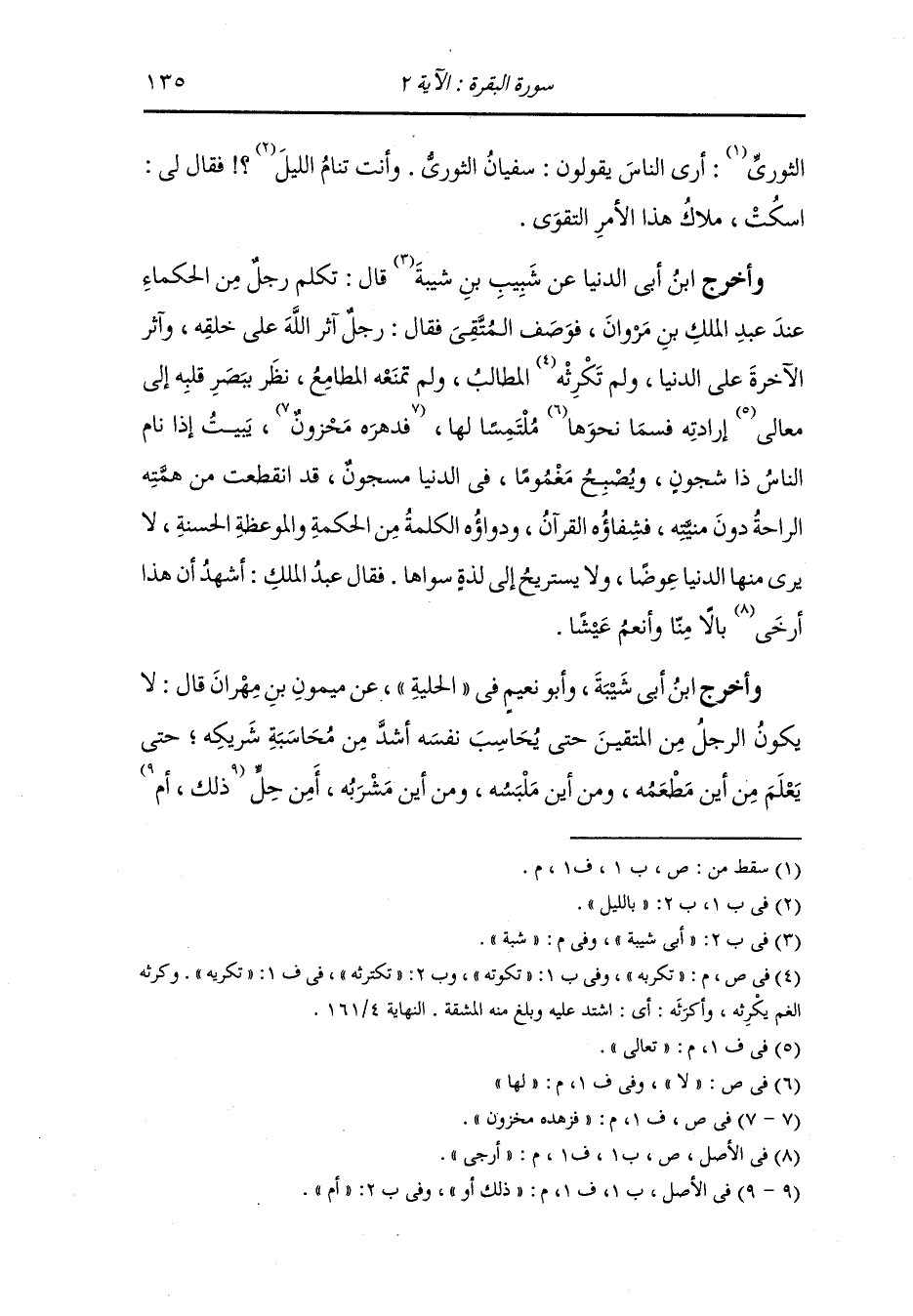 وأخرج ابن أبي الدنيا عن شبيب بن شبة قال : تكلم رجل من الحكماء عند عبد الملك بن مروان فوصف المتقي فقال : رجل آثر الله على خلقه وآثر الآخرة على الدنيا ولم تكربه المطالب ولم تمنعه المطامع نظر ببصر قلبه إلى معالي إرادته فسما لها ملتمسا لها فزهده مخزون يبيت إذا نام الناس ذا شجون ويصبح مغموما في الدنيا مسجون قد انقطعت من همته الراحة دون منيته فشفاؤه القرآن ودواؤه الكلمة من الحكمة والموعظة الحسنة لا يرى منها الدنيا عوضا ولا يستريح إلى لذة سواها ، فقال عبد الملك : أشهد أن هذا أرجى ء بالا منا وأنعم عيشا.