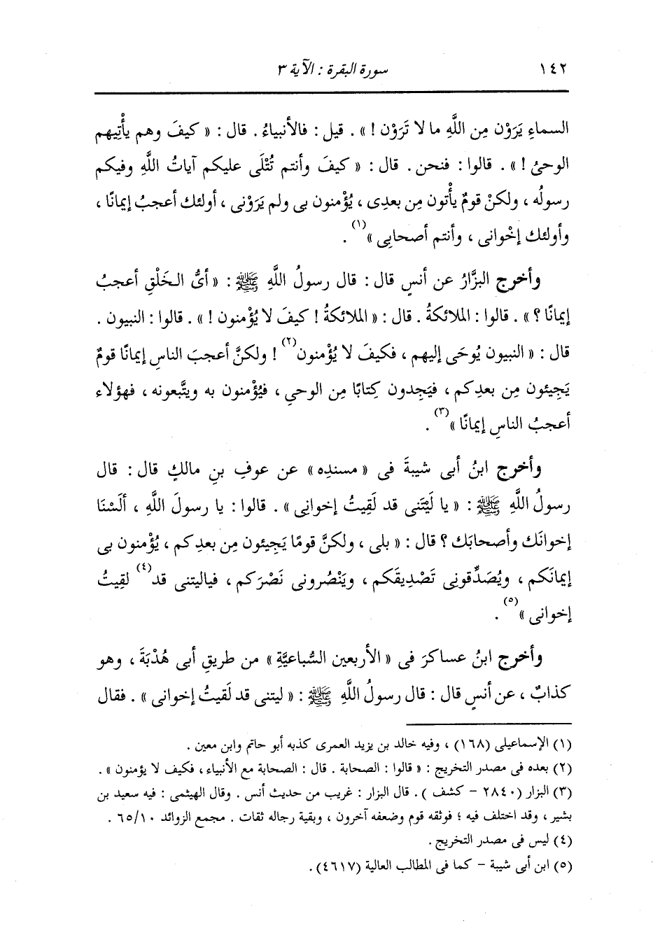 وأخرج البزار عن أنس قال : قال رسول الله صلى الله عليه وسلم أي الخلق أعجب إيمانا قالوا : الملائكة ، ، قال : الملائكة ، كيف لا يؤمنون قالوا : النبيون ، قال : النبيون يوحى إليهم فكيف لا يؤمنون ولكن أعجب الناس إيمانا قوم يجيئون من بعدكم فيجدون كتابا من الوحي فيؤمنون به ويتبعونه ، فهؤلاء أعجب الناس إيمانا.