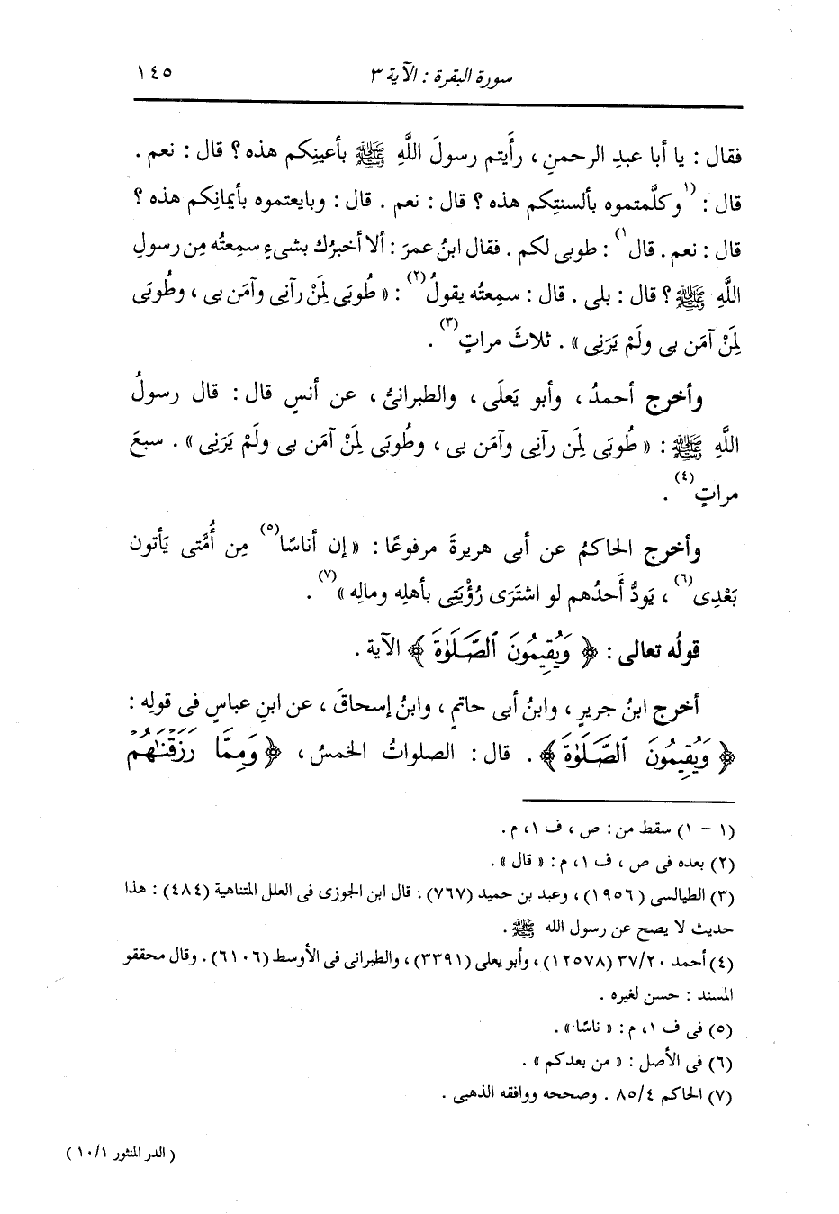وأخرج أحمد وأبو يعلى والطبراني عن أنس قال : قال رسول الله صلى الله عليه وسلم طوبى لمن رآني وآمن بي وطوبى لمن آمن بي ولم يرني سبع مرات.