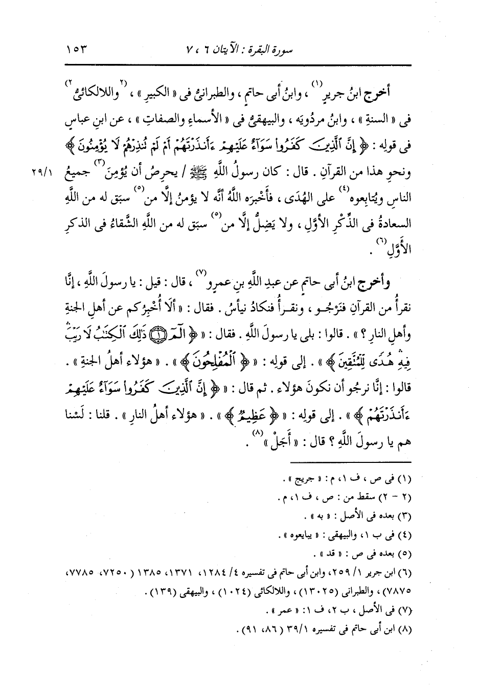 أخرج ابن جريج ، وَابن أبي حاتم والطبراني في الكبير في السنة ، وَابن مردويه والبيهقي في الأسماء والصفات عن ابن عباس في قوله {إن الذين كفروا سواء عليهم أأنذرتهم أم لم تنذرهم لا يؤمنون} ونحو هذا من القرآن قال : كان رسول الله صلى الله عليه وسلم يحرص أن يؤمن جميع الناس ويتابعوه على الهدى فأخبره الله أنه لايؤمن إلا من سبق له من الله السعادة في الذكر الأول ولا يضل إلا من سبق له من الله الشقاء في الذكر الأول.