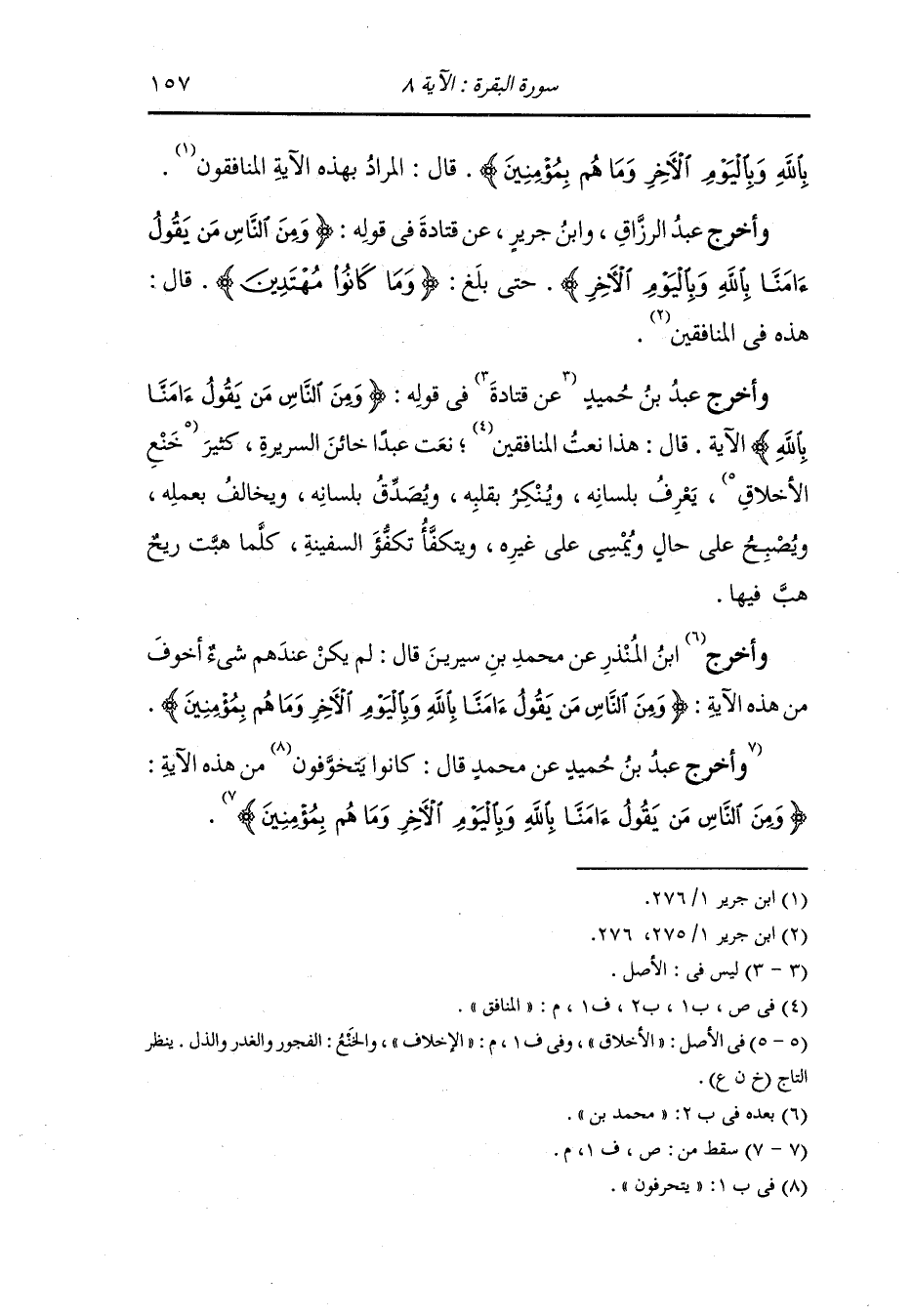 وأخرج عبد الرزاق ، وَابن جَرِير عن قتادة في قوله {ومن الناس من يقول آمنا بالله وباليوم الآخر} حتى بلغ {وما كانوا مهتدين} قال : هذه في المنافقين.