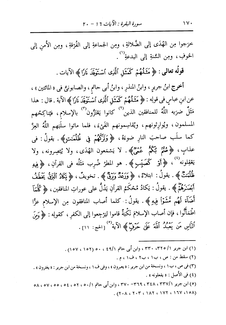 أخرج ابن جرير ، وَابن المنذر ، وَابن أبي حاتم والصابوني في المائتين عن ابن عباس في قوله {مثلهم كمثل الذي استوقد نارا} الآية ، قال : هذا ضربه الله للمنافقين كانوا يعتزون بالإسلام فيناكحم المسلمون ويوارثوهم ويقاسمونهم الفيء ، فلما ماتوا سلبم الله العز كما سلب صاحب النار ضوءه {وتركهم في ظلمات} يقول في عذاب {صم بكم عمي} لا يسمعون الهدى ولايبصرونه ولا يعقلونه {أو كصيب} هو المطر ، ضرب مثله في القرآن {فيه ظلمات} يقول : ابتلاء {ورعد وبرق} تخويف {يكاد البرق يخطف أبصارهم} يقول : يكاد محكم القرآن يدل على عورات المنافقين {كلما أضاء لهم مشوا فيه} يقول : كلما أصاب المنافقون من الإسلام اطمأنوا فإن أصاب الإسلام نكبة قاموا ليرجعوا إلى الكفر كقوله (ومن الناس من يعبد الله على حرف) (الحج الآية 11) الآية