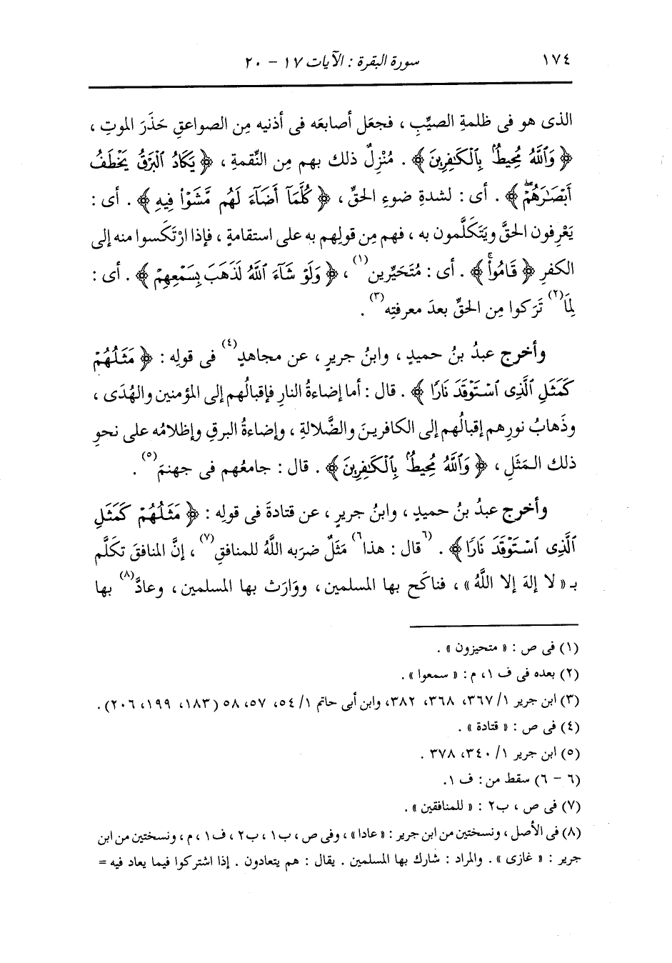 وأخرج عَبد بن حُمَيد ، وَابن جَرِير عن قتادة في قوله {مثلهم كمثل الذي استوقد نارا} قال : هذا مثل ضربه الله للمنافقين ، إن المنافق تكلم بلا إله إلا الله فناكح بها المسلمين ووارث بها المسلمين وغازى بها