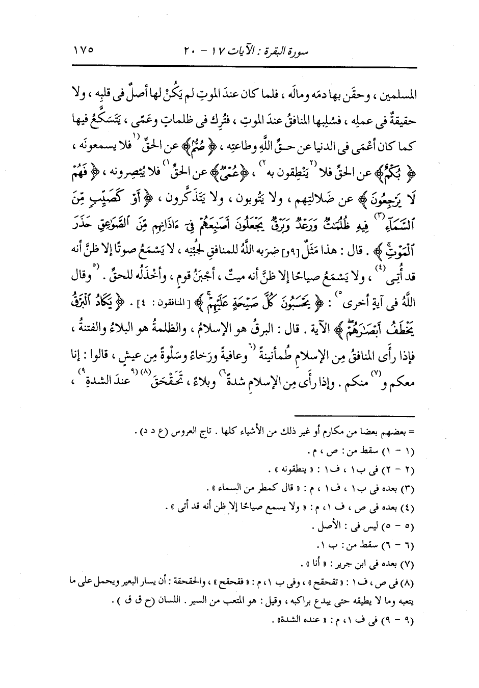 المسلمين وحقن بها دمه وماله ، فلما كان عند الموت لم يكن لها أصل في قلبه ولا حقيقة في عمله فسلبها المنافق عند الموت فترك في ظلمات وعمى يتسكع فيها ، كما كان أعمى في الدنيا عن حق الله وطاعته صم عن الحق فلا يبصرونه {فهم لا يرجعون} عن ضلالتهم ولا يتوبون ولا يتذكرون {أو كصيب من السماء فيه ظلمات ورعد وبرق يجعلون أصابعهم في آذانهم من الصواعق حذر الموت} قال : هذا مثل ضربه الله للمنافق لجنبه لا يسمع صوتا إلا ظن أنه قد أتي ولا يسمع صياحا إلا ظن أنه قد أتي ولا يسمع صياحا إلا ظن أنه ميت ، أجبن قوم وأخذله للحق ، وقال الله في آية أخرى (يحسبون كل صيحة عليهم) (المنافقون الآية 4) {يكاد البرق يخطف أبصارهم} الآية ، قال {البرق} هو الإسلام والظلمة هو البلاء والفتنة ، فإذا رأى المنافق من الإسلام طمأنينة وعافية ورخاء وسلوة من عيش {قالوا إنا معكم} ومنكم وإذا رأى من الإسلام شدة وبلاء فقحقح عند الشدة