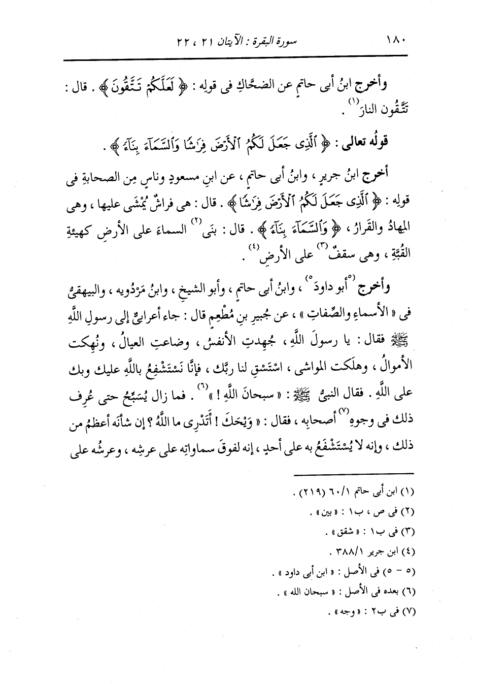 وأخرج أبو داود ، وَابن أبي حاتم وأبو الشيخ ، وَابن مردويه والبيهقي في الأسماء والصفات عن جبير بن مطعم قال جاء أعرابي إلى رسول الله صلى الله عليه وسلم فقال : يا رسول الله جهدت الأنفس وضاعت العيال ونهكت الأموال وهلكت المواشي ، استسق لنا ربك فإنا نستشفع بالله عليك وبك على الله ، فقال النَّبِيّ صلى الله عليه وسلم سبحان الله فما زال يسبح حتى عرف ذلك في وجوه أصحابه فقال : ويحك أتدري ما الله إن شأنه أعظم من ذاك وإنه لا يستشفع به على أحد وإنه لفوق