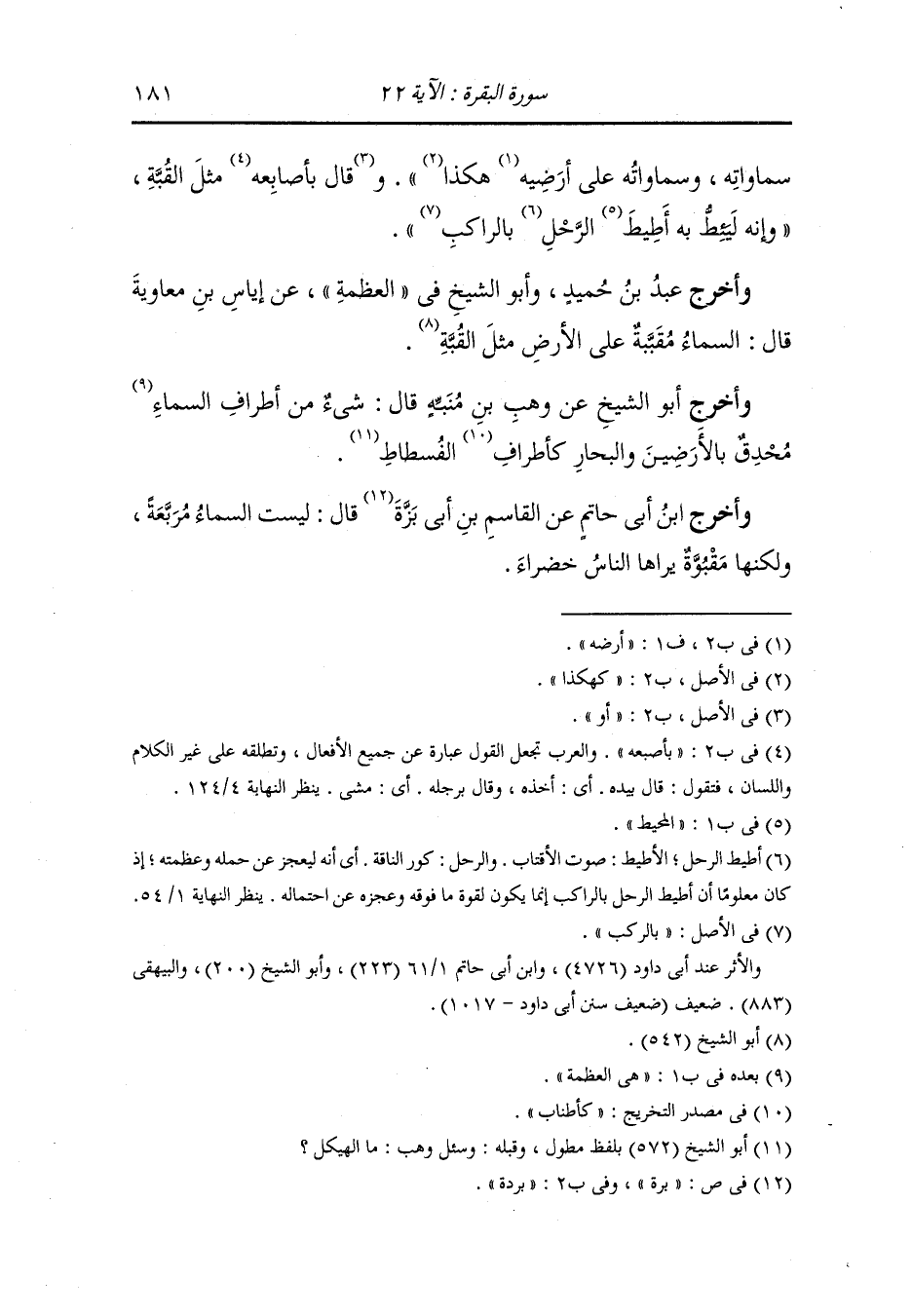 وأخرج ابن أبي حاتم عن القاسم بن أبي برة قال : ليست السماء مربعة ولكنها مقببة يراها الناس خضراء
