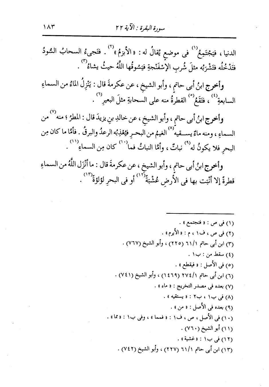 وأخرج ابن ابي حاتم وأبو الشيخ عن عكرمة قال : ينزل الماء من السماء السابعة فتقع القطرة منه على السحابة مثل البعير.