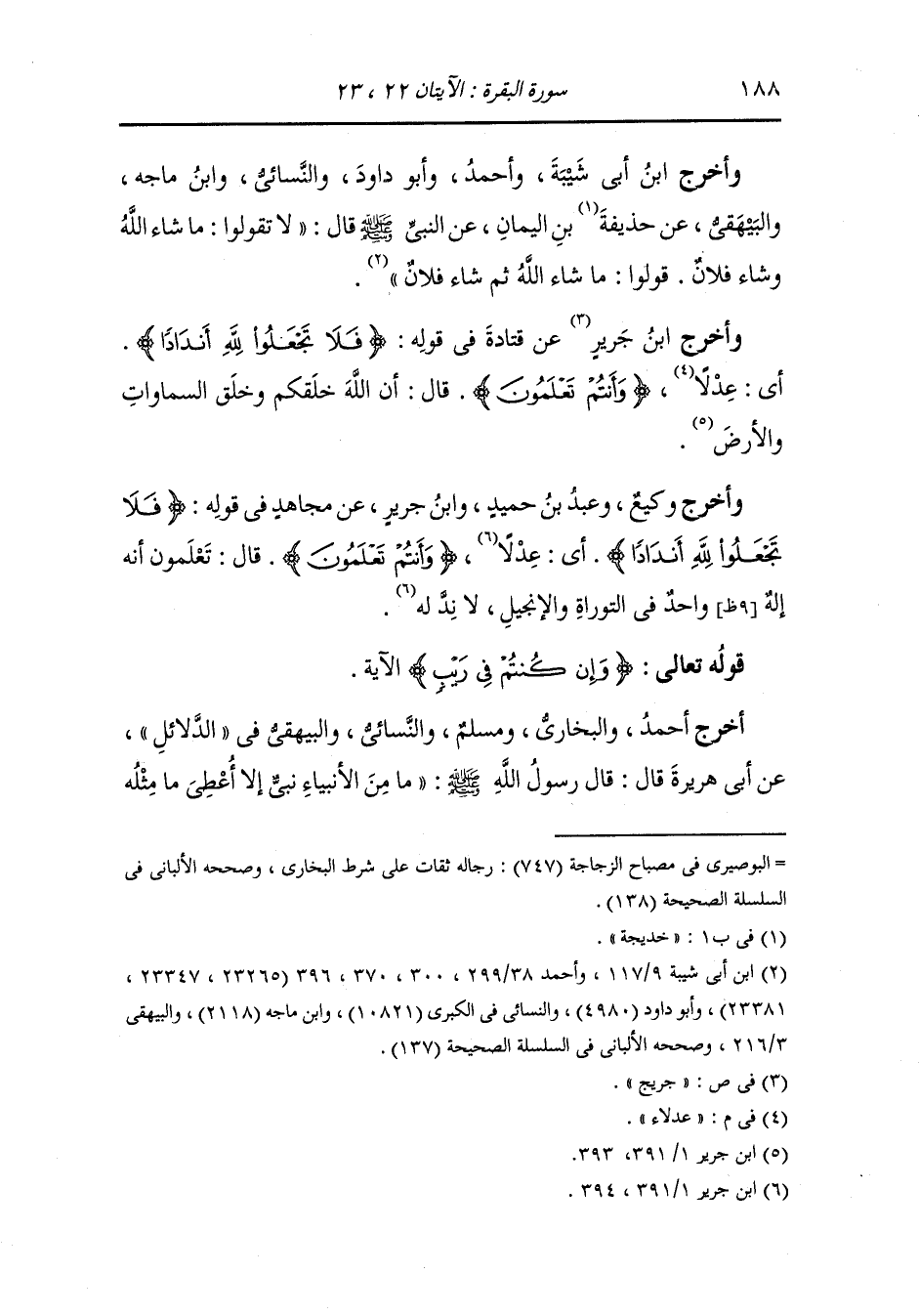 وأخرج ابن أبي شيبة وأحمد وأبو داود والنسائي ، وَابن ماجه والبيهقي عن حذيفة ابن اليمان عن النَّبِيّ صلى الله عليه وسلم قال لا تقولوا ما شاء الله وشاء فلان ، قولوا : ما شاء الله ثم شاء فلان.