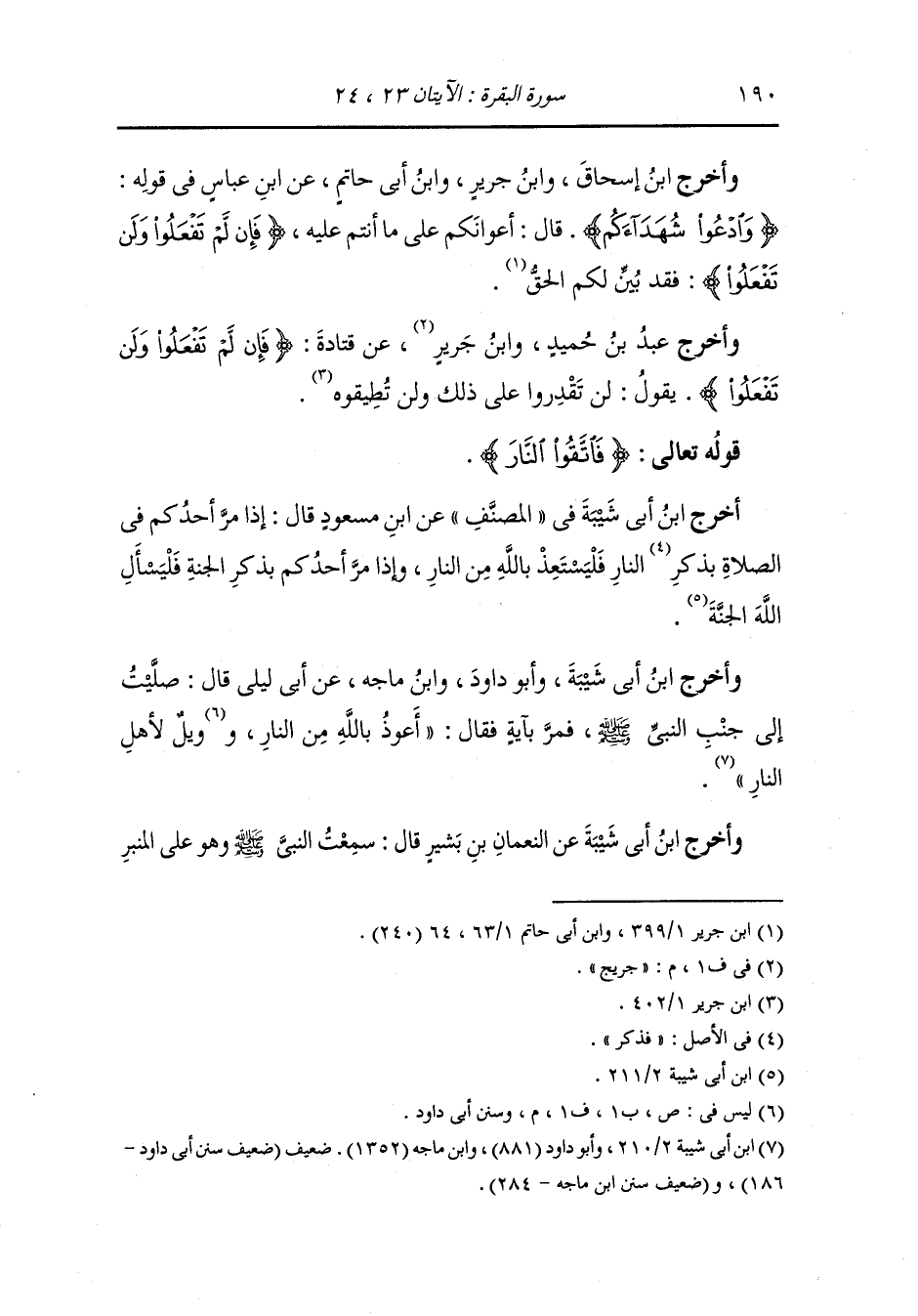 وأخرج عَبد بن حُمَيد ، وَابن جريج عن قتادة {فإن لم تفعلوا ولن تفعلوا} يقول : لن تقدروا على ذلك ولن تطيقوه ، أما قوله تعالى : {فاتقوا النار}.