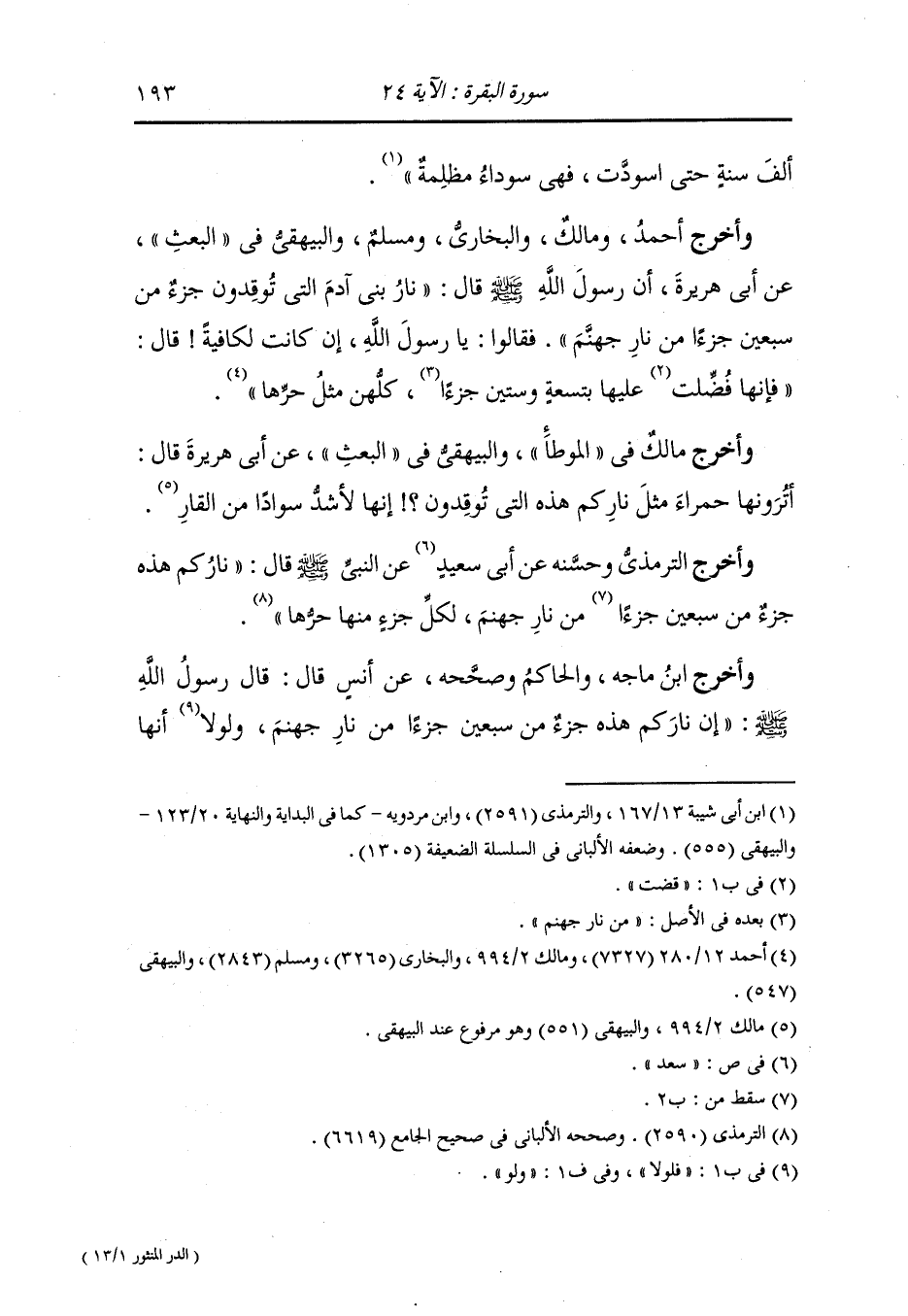 وأخرج أحمد ومالك والبخاري ومسلم والبيهقي في البعث عن أبي هريرة أن رسول الله صلى الله عليه وسلم قال نار بني آدم التي توقدون جزء من سبعين جزء من نار جهنم