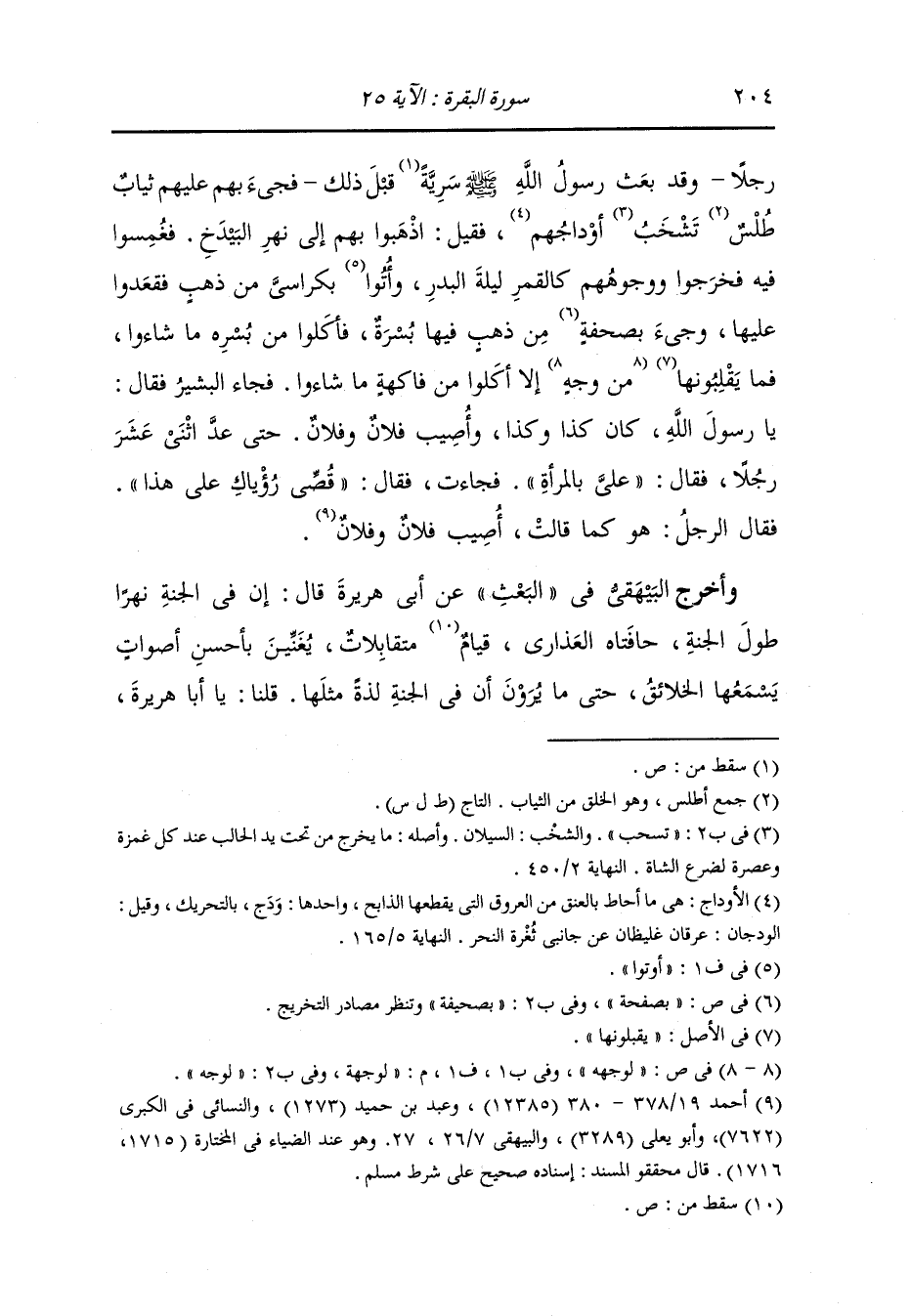 رجلا وقد بعث رسول الله صلى الله عليه وسلم سرية قبل ذلك فجيء بهم عليهم ثياب طلس تشخب أوداجهم فقيل : اذهبوا بهم إلى نهر البيدخ فغمسوا فيه فخرجوا وحوهم كالقمر ليلة البدر وأتوا بكراسي من ذهب فقعدوا عليها وجيء بصحفة من ذهب فيها بسرة فأكلوا من بسره ما شاؤا فما يقبلونها لوجهة إلا أكلوا من فاكهة ما شاؤا فجاء البشير فقال : يا رسول الله كان كذا وكذا ، وأصيب فلان وفلان حتى عد اثني عشر رجلا فقال : علي بالمرأة فجاءت فقال : قصي رؤياك على هذا فقال الرجل : هو كما قالت أصيب فلان وفلان.