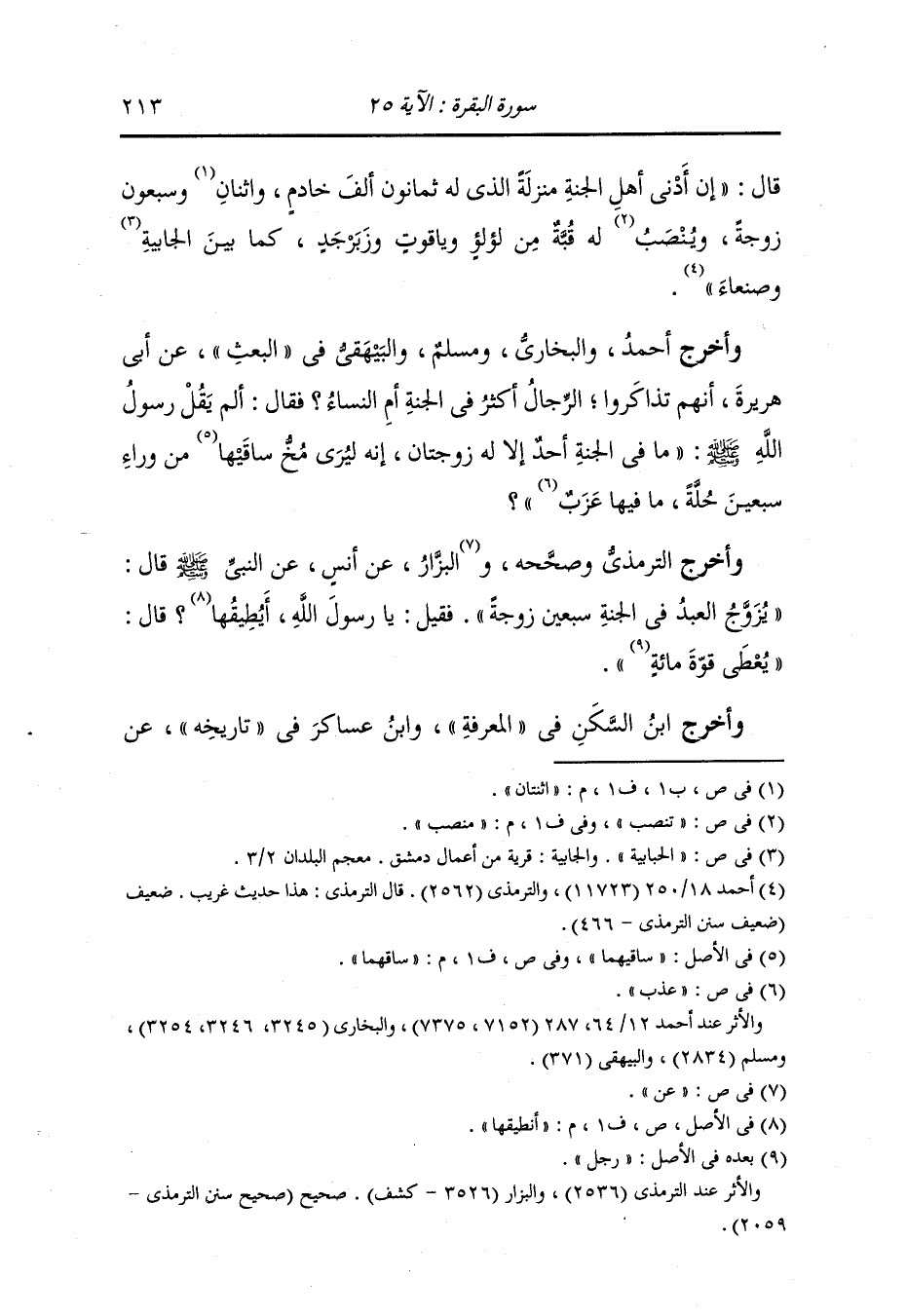 قال إن أدنى أهل الجنة منزلة الذي له ثمانون ألف خادم واثنتان وسبعون زوجة ومنصب له قبة من لؤلؤ وياقوت وزبرجد كما بين الجابية وصنعاء.