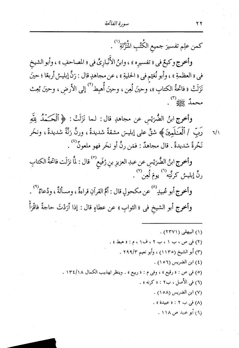 وأخرج ابن الضريس عن عبد العزيز بن ربيع قال : لما نزلت فاتحة الكتاب رن إبليس كرنته يوم لعن.