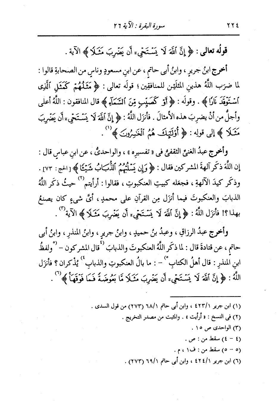 وأخرج عبد الغني الثقفي في تفسيره والواحدي عن الن عباس قال : إن الله ذكر آلهة المشركين فقال (وإن يسلبهم الذباب شيئا) وذكر كيد الآلهة كبيت العنكبوت فقالوا : أرأيت حيث ذكر الله الذباب والعنكبوت فيما أنزل من القرآن على محمد ، أي شيء كان يصنع بهذا فأنزل الله {إن الله لا يستحيي أن يضرب مثلا} الآية.