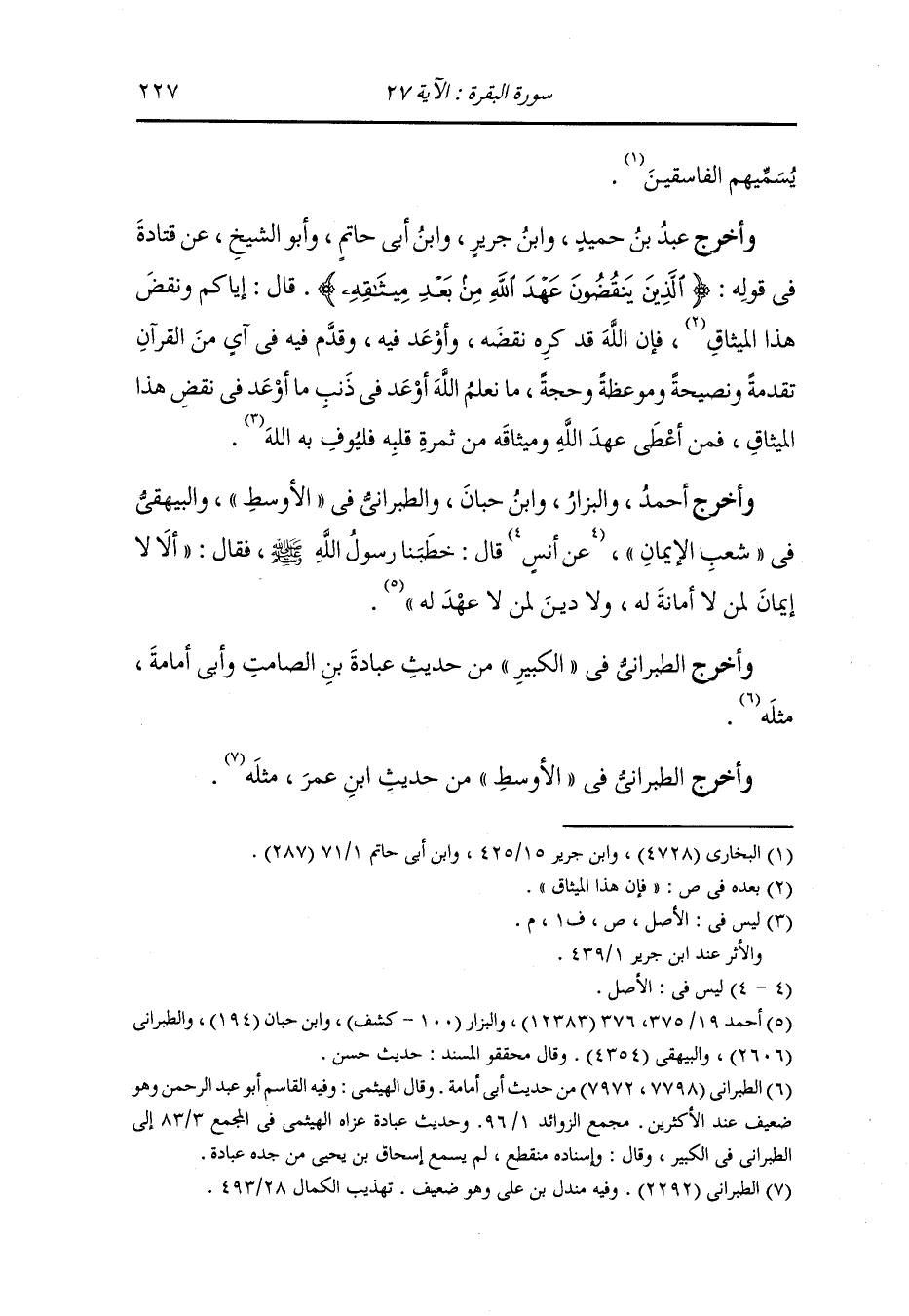 وأخرج عَبد بن حُمَيد ، وَابن جَرِير ، وَابن أبي حاتم وأبو الشيخ عن قتادة في قوله {الذين ينقضون عهد الله من بعد ميثاقه} قال : إياكم ونقض هذا الميثاق فإن الله قد كره نقضه وأوعد فيه وقدم فيه في آي من القرآن تقدمة ونصيحة وموعظة وحجة ، ما نعلم الله أوعد في ذنب ما أوعد في نقض هذا الميثاق ، فمن أعطى عهد الله وميثاقه من ثمرة قلبه فليوف به.