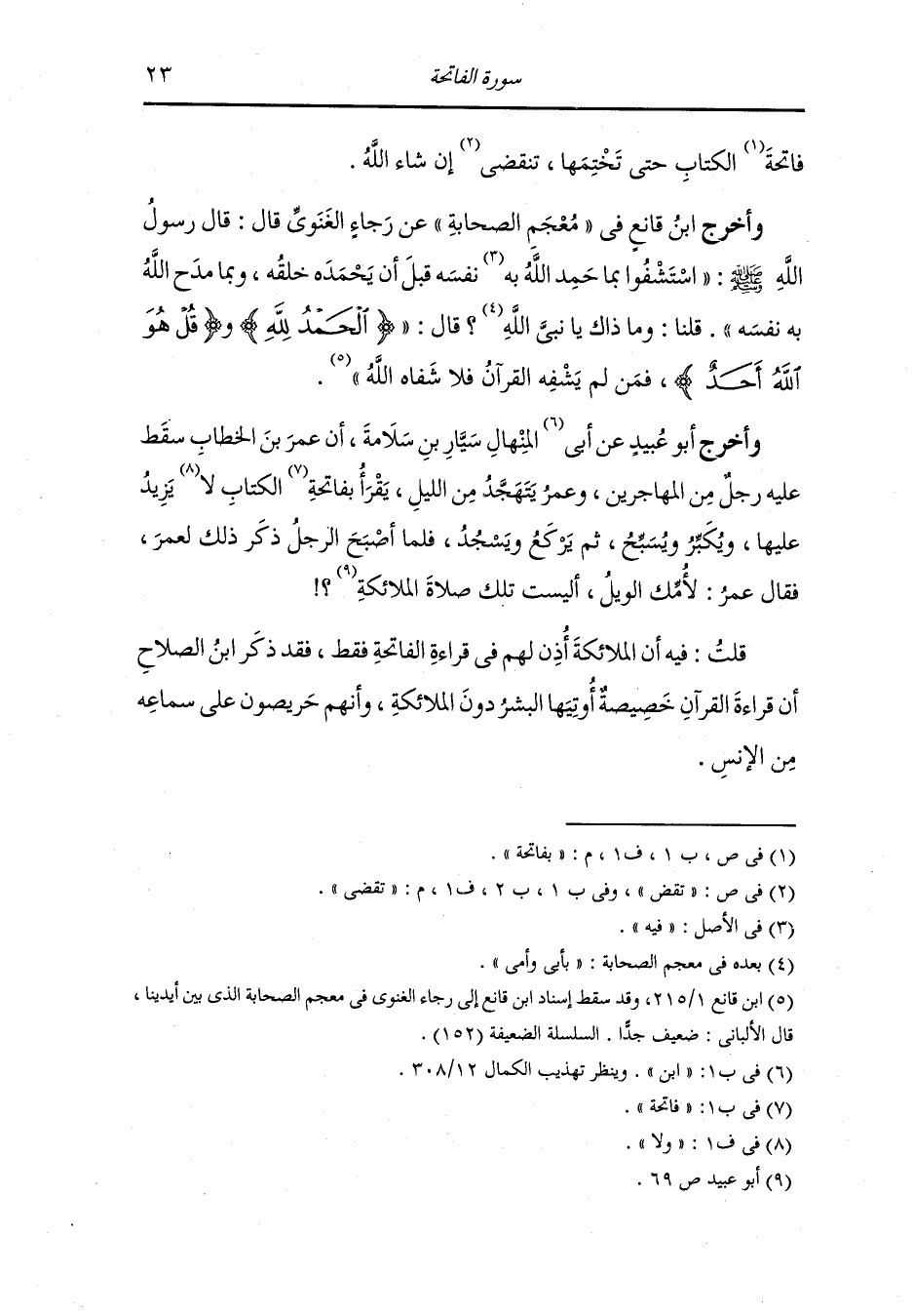 وأخرج أبو عبيد عن أبي المنهال سيار بن سلامة أن عمر بن الخطاب سقط عليه رجل من المهاجرين وعمر يتهجد من الليل يقرأ بفاتحة الكتاب لايزيد عليها ويكبر ويسبح ثم يركع ويسجد ، فلما أصبح الرجل ذكر ذلك لعمر فقال عمر : لامك [ لأمك ] الويل ، أليست تلك صلاة الملائكة قلت : فيه أن الملائكة أذن لهم في قراءة الفاتحة فقط فقد ذكر ابن الصلاح أن قراءة القرآن خصيصة أوتيها البشر دون الملائكة وأنهم حريصون على سماعه من الإنس
