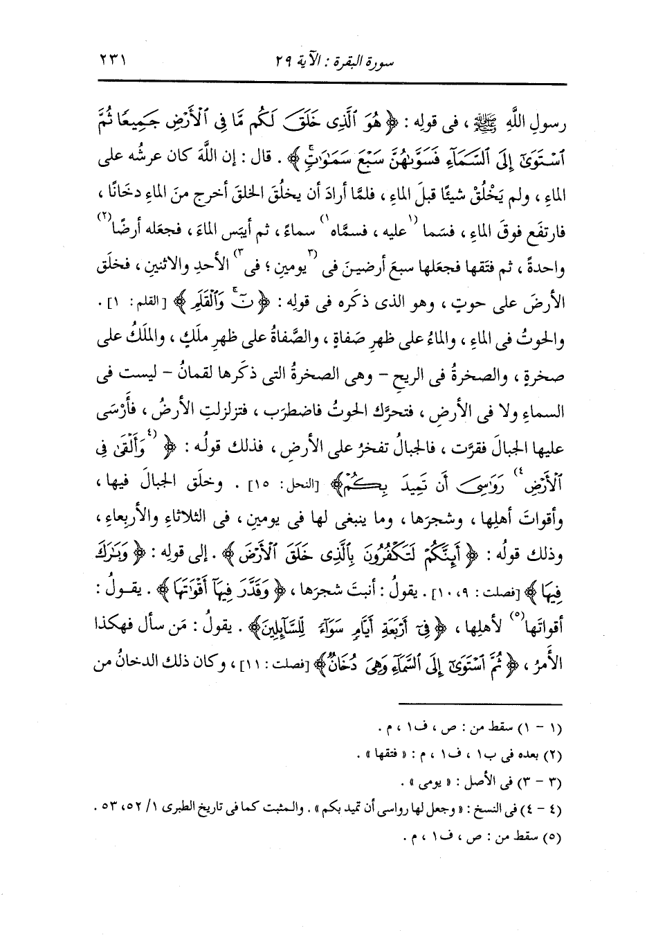 رسول الله صلى الله عليه وسلم في قوله قوله تعالى : {هو الذي خلق لكم ما في الأرض جميعا ثم استوى إلى السماء فسواهن سبع سماوات} قال : إن الله كان عرشه على الماء ولم يخلق شيئا قبل الماء فلما أراد أن يخلق أخرج من الماء دخانا فارتفع فوق الماء فسما سماء ثم أيبس الماء فجعله أرضا فتقها واحدة ثم فتقها فجعلها سبع أرضين في يومين ، في الأحد والاثنين فخلق الأرض على حوت وهو الذي ذكره في قوله (ن والقلم) والحوت في الماء والماء على ظهر صفاة والصفاة على ظهر ملك والملك على صخرة والصخرة في الريح وهي الصخرة التي ذكرها لقمان ، ليست في السماء ولا في الأرض فتحرك الحوت فاضطرب