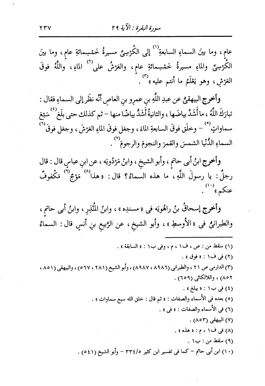 وأخرج البيهقي عن عبد الله بن عمرو بن العاص أنه نظر إلى السماء فقال : تبارك الله ما أشد بياضها والثانية أشد بياضها منها ثم كذلك حتى بلغ سبع سموات ، وخلق فوق السابعة الماء وجعل فوق الماء العرش وجعل فوق السماء الدنيا الشمس والقمر والنجوم والرجوم.