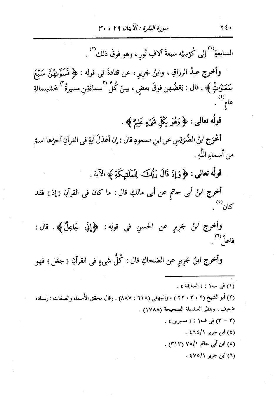 وأخرج عبد الرزاق ، وَابن جَرِير عن قتادة في قوله {فسواهن سبع سماوات} قال : بعضهن فوق بعض بين كل سمائين مسيرة خمسمائة عام ، أما قوله تعالى : {وهو بكل شيء عليم}.