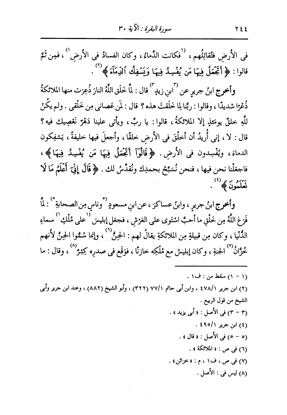 وأخرج ابن جرير عن ابن زيد قال : لما خلق الله النار ذعرت منها الملائكة ذعرا شديدا وقالوا : ربنا لم خلقت هذه قال : لمن عصاني من خلقي - ولم يكن لله خلق يمئذ إلا الملائكة - قالوا : يا رب ويأتي دهر نعصيك فيه قال : لا ، إني أريد أن أخلق في الأرض خلقا وأجعل فيها خليفة يسفكون الدماء ويفسدون في الأرض قالوا {أتجعل فيها من يفسد فيها} فاجعلنا نحن فيها {ونحن نسبح بحمدك ونقدس لك قال إني أعلم ما لا تعلمون}.