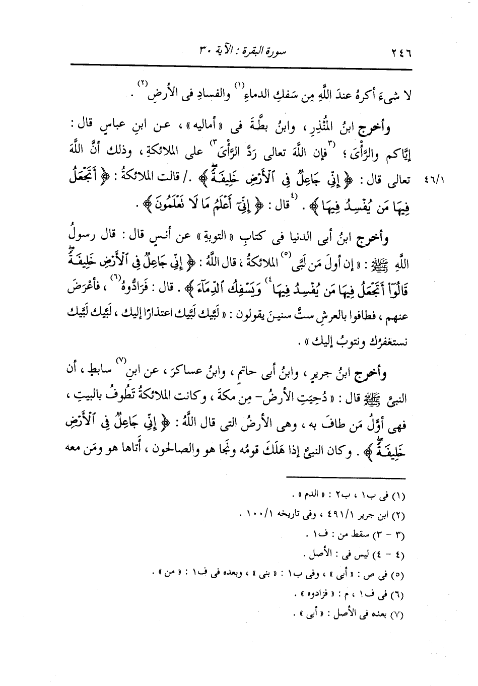 وأخرج ابن أبي الدنيا في كتاب التوبة عن أنس قال قال رسول الله صلى الله عليه وسلم : إن أول من لبى الملائكة قال الله {إني جاعل في الأرض خليفة قالوا أتجعل فيها من يفسد فيها ويسفك الدماء} قال : فزادوه فأعرض عنهم فطافوا بالعرش ست سنين يقولون : لبيك لبيك اعتذارا إليك لبيك لبيك نستغفرك ونتوب إليك.