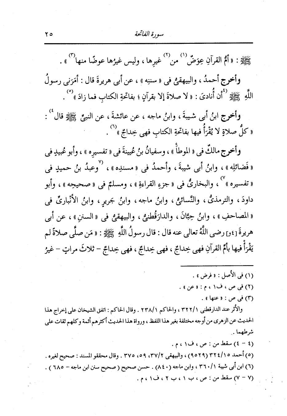 وأخرج مالك في الموطأ وسفيان بن عيينة في تفسيره وأبو عبيد في فضائله ، وَابن أبي شيبة وأحمد في مسنده والبخاري في جزء القراءة ومسلم في صحيحه وأبو داود والترمذي والنسائي ، وَابن ماجة ، وَابن جَرِير ، وَابن الأنباري في المصاحف ، وَابن حبان والدارقطني والبيهقي في السنن عن أبي هريرة قال : قال رسول الله صلى الله عليه وسلم من صلى صلاة لم يقرأ فيها بأم الكتاب فهي خداج فهي خداج ثلاث مرات ، غير