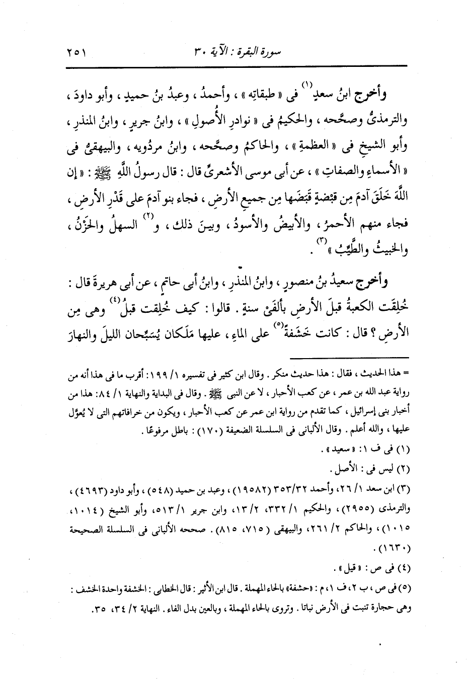 وأخرج ابن سعد في طبقاته وأحمد ، وعَبد بن حُمَيد وأبو داود والترمذي وصححه والحكيم في نوادر الأصول ، وَابن جَرِير ، وَابن المنذر وأبو الشيخ في العظمة والحاكم وصححه ، وَابن مردويه والبيهقي في الأسماء والصفات عن أبي موسى الأشعري قال قال رسول الله صلى الله عليه وسلم : إن الله خلق آدم من قبضة قبضها من جميع الأرض فجاء بنو آدم على قدر الأرض ، جاء منهم الأحمر والأبيض والأسود وبين ذلك والسهل والحزن والخبيث والطيب.