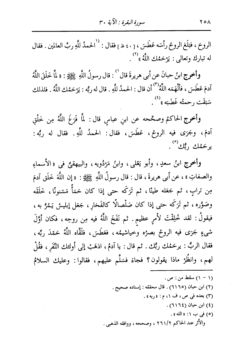 وأخرج الحاكم وصححه عن ابن عباس قال : لما فرغ الله من خلق آدم وجرى فيه الروح عطس فقال : الحمد لله فقال له ربه : يرحمك الله.