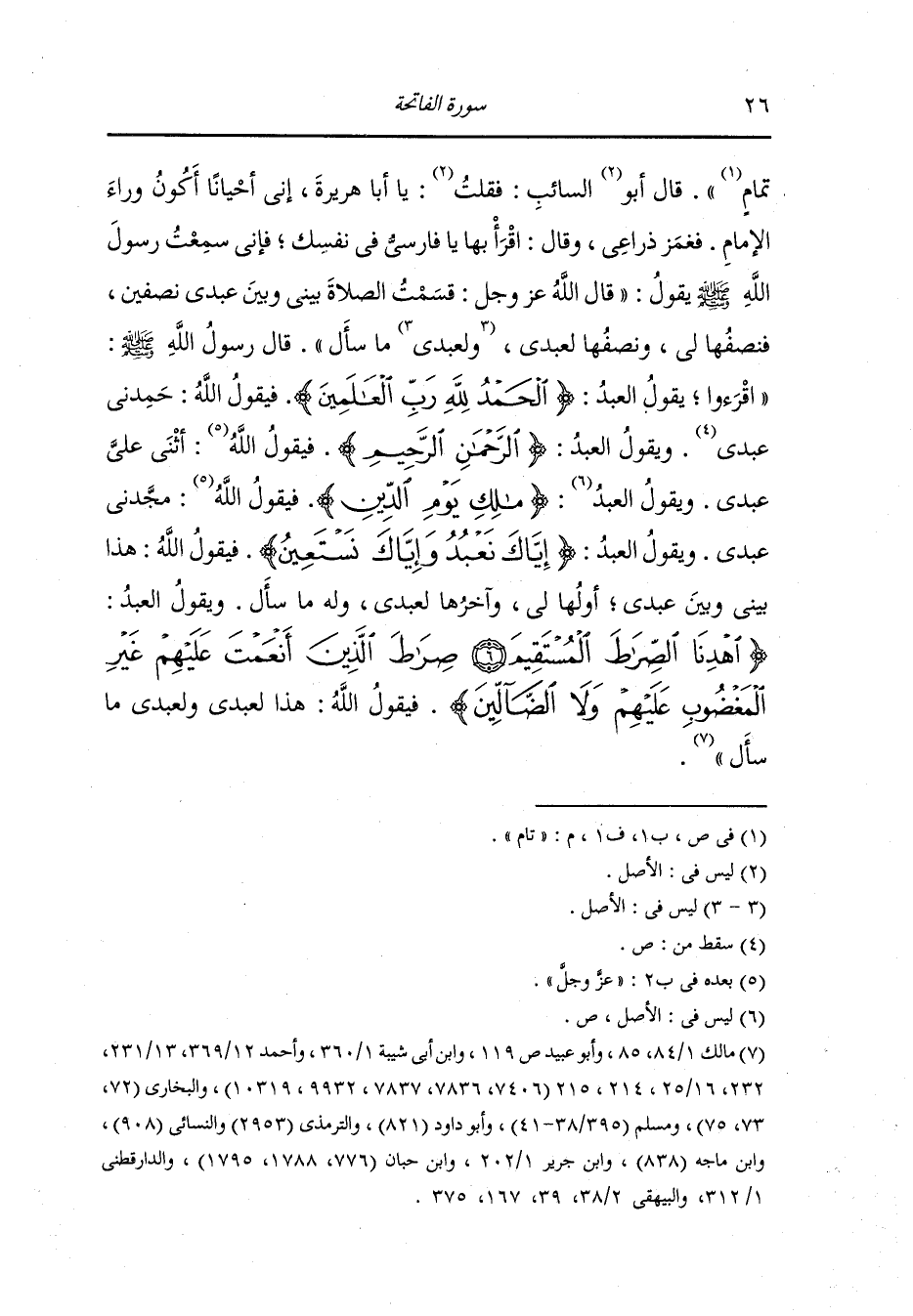 تام ، قال أبو السائب : فقلت ياأبا هريرة إني أحيانا أكون وراء الإمام ، فغمز ذراعي وقال : اقرأ بها يا فارسي في نفسك فإني سمعت رسول الله صلى الله عليه وسلم يقول : قال الله عز وجل قسمت الصلاة بيني وبين عبدي نصفين فنصفها لي ونصفها لعبدي ولعبدي ما سأل قال رسول الله صلى الله عليه وسلم : اقرؤا ، يقول العبد {الحمد لله رب العالمين} فيقول الله : حمدني عبدي ، ويقول العبد {الرحمن الرحيم} فيقول الله : أثنى علي عبدي ، ويقول العبد {مالك يوم الدين} فيقول الله مجدني عبدي ويقول العبد {إياك نعبد وإياك نستعين} فيقول الله : هذا بيني وبين عبدي أولها لي وآخرها لعبدي وله ماسأل ، ويقول العبد {اهدنا الصراط المستقيم صراط الذين أنعمت عليهم غير المغضوب عليهم ولا الضالين} فيقول الله : هذا لعبدي ولعبدي ما سأل