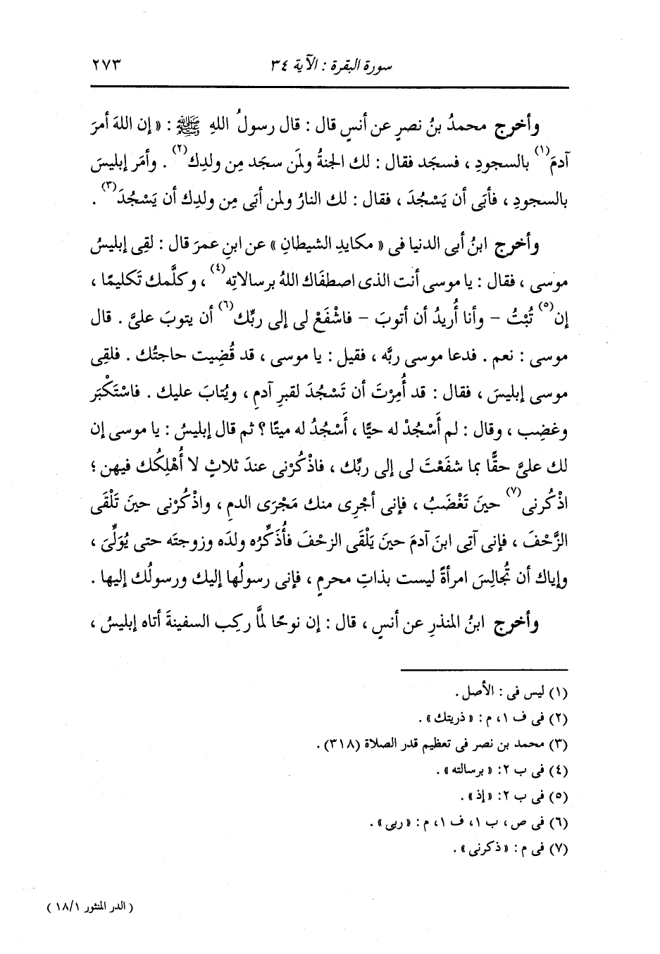 وأخرج محمد بن نصر عن أنس قال قال رسول الله صلى الله عليه وسلم : إن الله أمر آدم بالسجود فسجد فقال : لك الجنة ولمن سجد من ذريتك وأمر إبليس بالسجود فأبى أن يسجد فقال : لك النار ولمن أبى من ولدك أن يسجد.