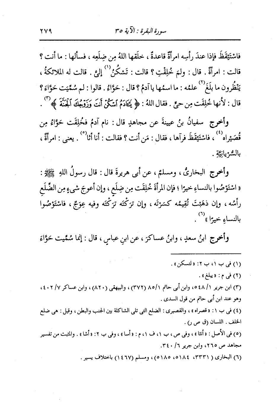 وأخرج سفيان بن عيينة عن مجاهد قال : نام آدم فخلقت حواء من قصيراه فاستيقظ فرآها فقال : من أنت فقالت : أنا أسا ، يعني امرأة بالسريانية.