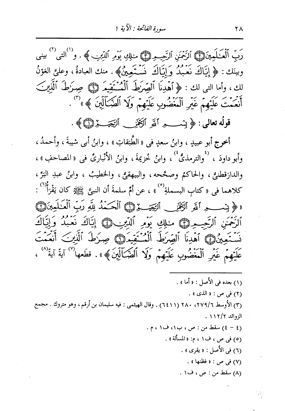 أخرج أبو عبيد ، وَابن سعد في الطبقات ، وَابن أبي شيبة وأحمد وأبو داود ، وَابن خزيمة ، وَابن الأنباري في المصاحف والدارقطني والحاكم وصححه والبيهقي والخطيب ، وَابن عبد البر كلاهما في كتاب المسألة عن أم سلمة أن النَّبِيّ صلى الله عليه وسلم كان يقرأ {بسم الله الرحمن الرحيم الحمد لله رب العالمين الرحمن الرحيم مالك يوم الدين إياك نعبد وإياك نستعين اهدنا الصراط المستقيم صراط الذين أنعمت عليهم غير المغضوب عليهم ولا الضالين} قطعها آية آية