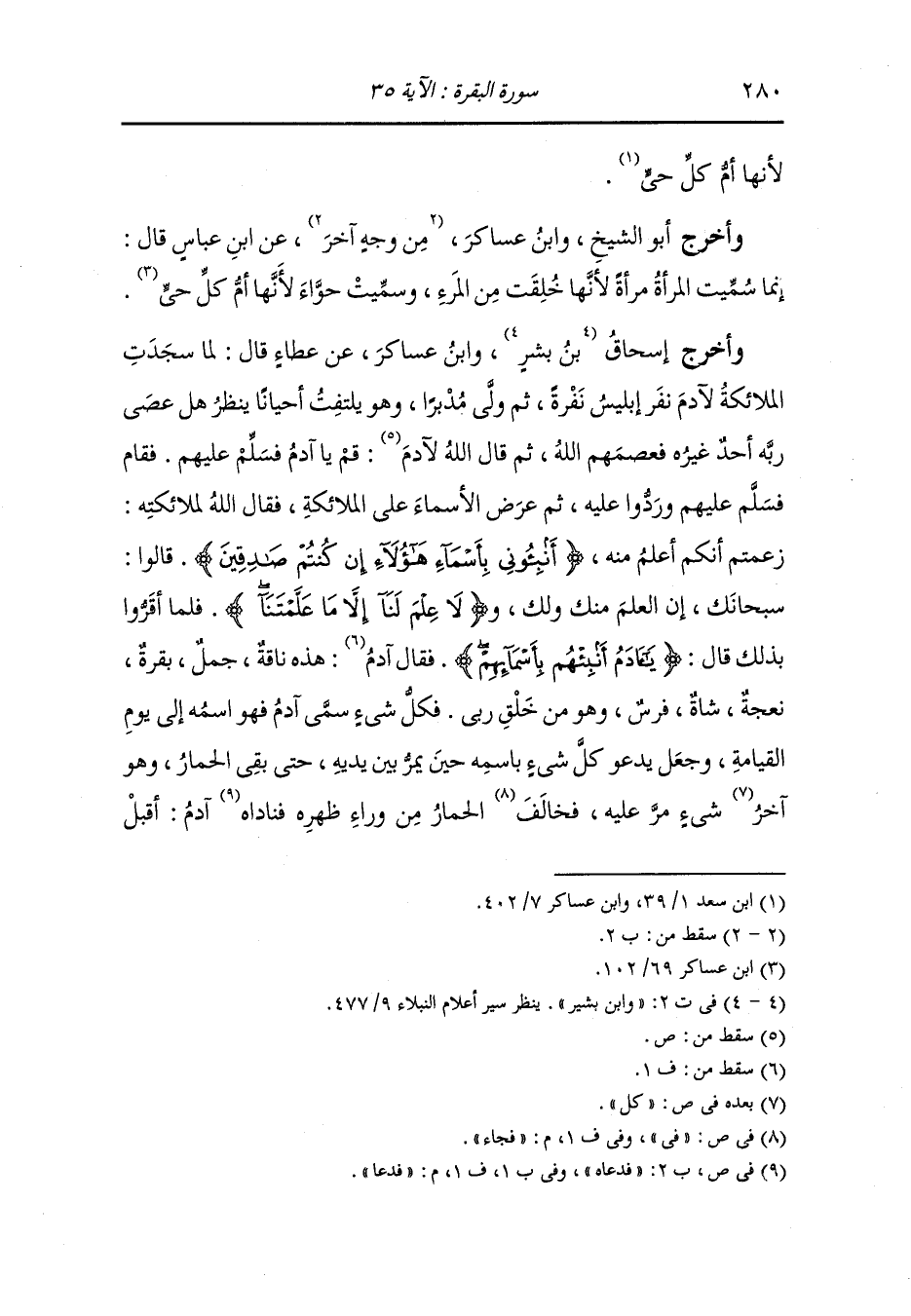 وأخرج اسحاق بن بشر ، وَابن عساكر عن عطاء قال : لما سجدت الملائكة لآدم نفر إبليس نفرة ثم ولى هاربا وهو يلتفت أحيانا ينظر هل عصى ربه أحد غيره ، فعصمهم الله ثم قال الله لآدم : قم يا آدم فسلم عليهم ، فقام فسلم عليهم وردوا عليه ثم عرض الأسماء على الملائكة فقال الله لملائكته : زعتم أنكم أعلم منه (أنبئوني بأسماء هؤلاء إن كنتم صادقين قالوا سبحانك) إن العلم منك ولك ولا علم لنا إلا ما علمتنا فلما أقروا بذلك (قال يا آدم أنبئهم بأسمائهم) فقال آدم : هذه ناقة جمل بقرة نعجة شاة فرس وهو من خلق ربي ، فكل شيء سمى آدم فهو اسمه إلى يوم القيامة وجعل يدهو كل شيء باسمه حين يمر بين يديه حتى بقي الحمار وهو آخر شيء مر عليه ، فجاء الحمار من وراء ظهره فدعا آدم : أقبل