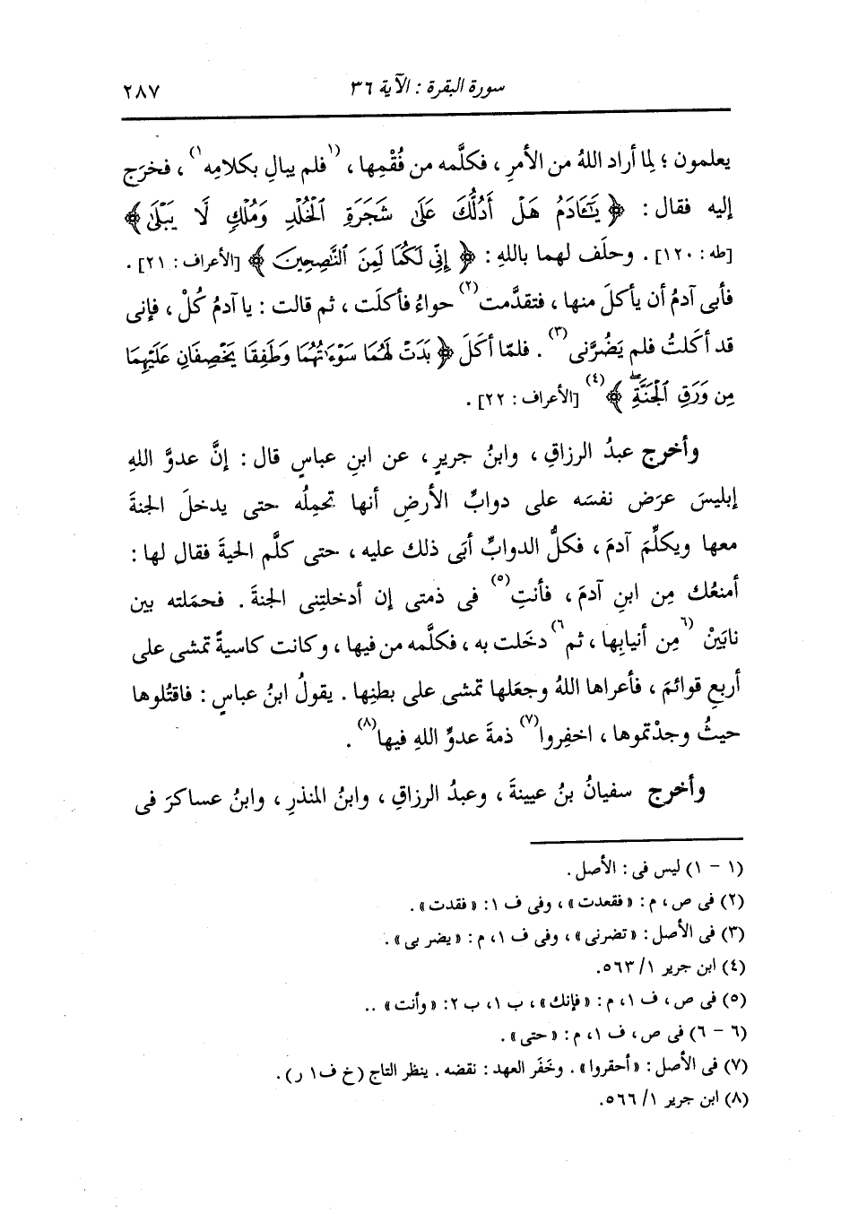 تاريخه عن ابن عباس قال : كانت الشجرة التي نهى الله عنها آدم وزوجته السنبلة فلما (أكلا منها بدت لهما سوآتهما) وكان الذي دارى عنهما من سوآتهما أظفارهما (وطفقا يخصفان عليهما من ورق الجنة) ورق التين يلزقان بعضه إلى بعض فانطلق آدم موليا في الجنة فأخذت برأسه شجرة من شجر الجنة فناداه به : يا آدم أمني تفر قال : لا ولكني استحيتك يا رب قال : أما كان لك فيما منحتك من الجنة وأبحتك منها مندوحة عما حرمت عليك قال : بلى يا رب ولك - وعزتك - ما حسبت أن أحدا يحلف بك كاذبا قال : فبعزتي لأهبطنك إلى الأرض ثم لا تنال العيش إلا كدا ، فاهبطا من الجنة وكانا يأكلان منها رغدا فاهبط إلى غير رغد من طعام ولا شراب فعلم صنعة الحديد وأمر بالحرث فحرث فزرع ثم سقى حتى إذا بلغ حصد درسه ثم ذراه ثم طحنه عجنه ثم خبزه ثم أكله فلم يبلغه حتى بلغ منه ما شاء الله أن يبلغ وكان آدم حين أهبط من الجنة بكى بكاء لم يبكه أحد فلو وضع بكاء داود على خطيئته وبكاء يعقوب على ابنه وبكاء ابن آدم على أخيه حين قتله ثم بكاء أهل الأرض ما عدل ببكاء آدم عليه السلام حين أهبط