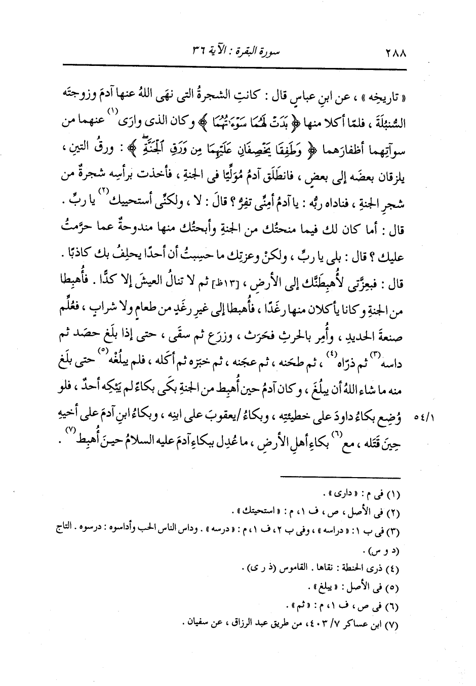 وأخرج ابن اسحاق في المبتدأ ، وَابن سعد وأحمد ، وعَبد بن حُمَيد ، وَابن أبي الدنيا في التوبة ، وَابن المنذر ، وَابن أبي حاتم والحاكم وصححه ابن مردويه والبيهقي في البعث والنشور عن أبي بن كعب عن النَّبِيّ صلى الله عليه وسلم قال إن آدم كان رجلا طوالا كأنه نخلة سحوق ستين ذراعا كثير شعر الرأس ، فلما ركب الخطيئة بدت له عورته وكان لا يراها قبل ذلك فانطلق هاربا في الجنة فتعلقت به شجرة فأخذت بناصيته فقال لها : أرسليني قال : لست بمرسلتك وناداه ربه : يا آدم أمني تفر قال : يا رب إني استحييتك قال : يا آدم اخرج من جواري فبعزتي لا أساكن من عصاني ولو خلقت ملء الأرض مثلك خلقا ثم عصوني لأسكنتهم دار العاصين ، قال : أرأيت إن أنا تبت ورجعت أتتوب علي قال : نعم ، يا آدم