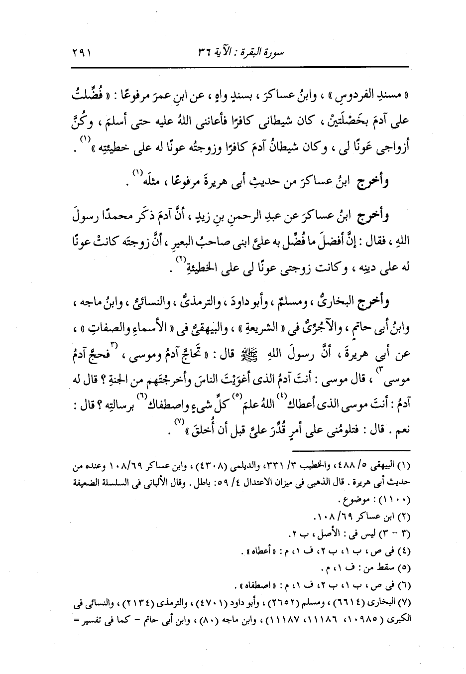وأخرج أبو داود والآجري في الشريعة والبيهقي في الأسماء والصفات عن عمر بن الخطاب قال قال رسول الله صلى الله عليه وسلم : إن موسى قال يا رب أرنا آدم الذي أخرجنا ونفسه من الجنة فأراه الله آدم فقال : أنت أبونا آدم فقال له آدم : نعم ، قال : أنت الذي نفخ الله فيك من روحه وعلمك الأسماء كلها وأمر الملائكة فسجدوا لك قال : نعم ، فقال : ما حملك على أن أخرجتنا من الجنة فقال له آدم : ومن أنت قال : موسى قال : أنت نبي بني إسرائي الذي كلمك الله من وراء
