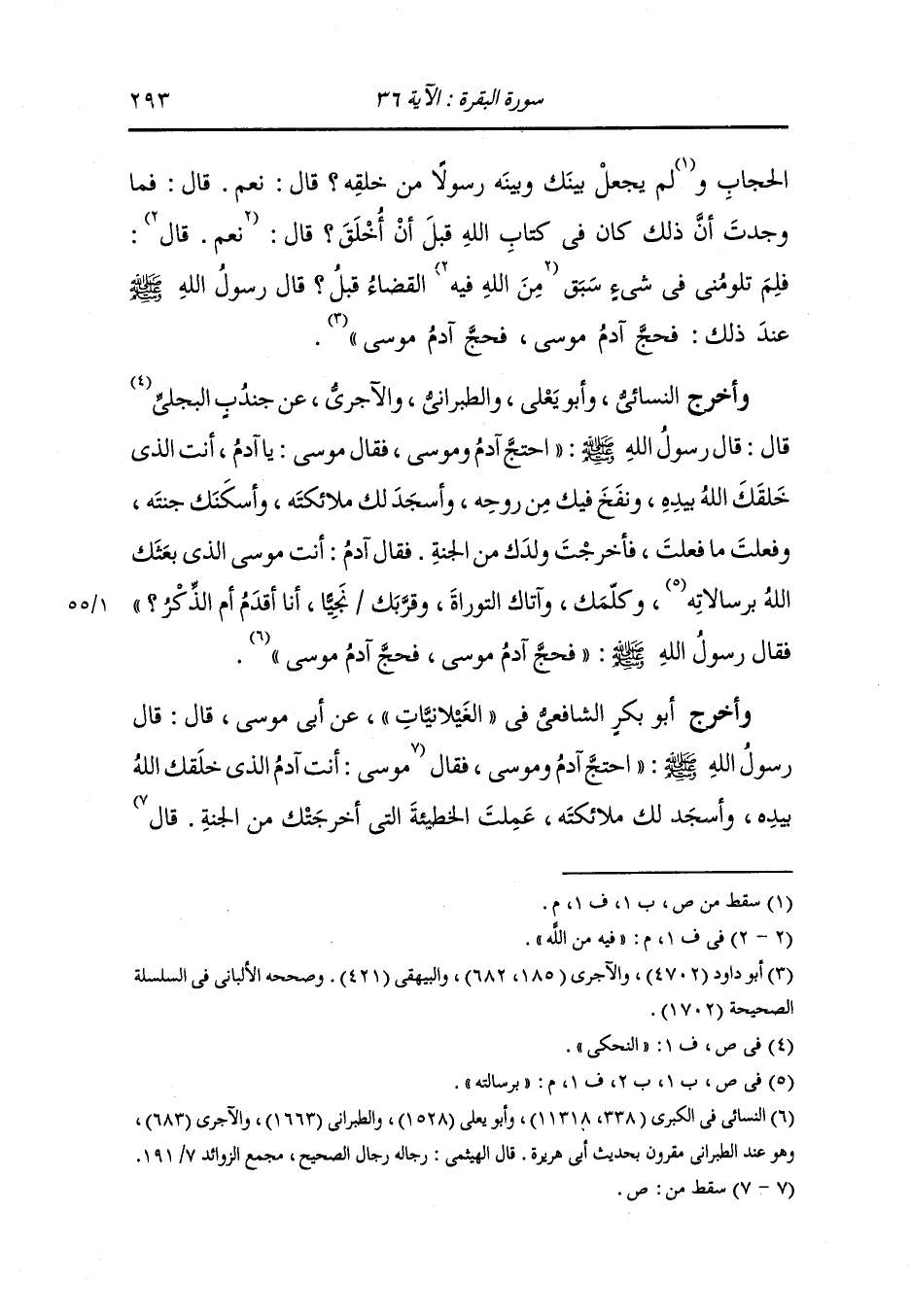 وأخرج ابن النجار عن ابن عمر قال قال رسول الله صلى الله عليه وسلم : التقى آدم وموسى عليهما السلام فقال له موسى : أنت آدم الذي خلقك الله بيده وأسجد لك ملائكته وأدخلك جنته ثم أخرجتنا منها فقال له آدم : أنت موسى الذي اصطفاك الله برسالته وقربك نجيا وأنزل عليك التوراة فأسألك بالذي أعطاك ذلك بكم تجده كتب علي قبل أن أخلق قال : أجده كتب عليك بالتوراة بألفي عام فحج آدم موسى ، أما قوله تعالى {وقلنا اهبطوا} الآية.