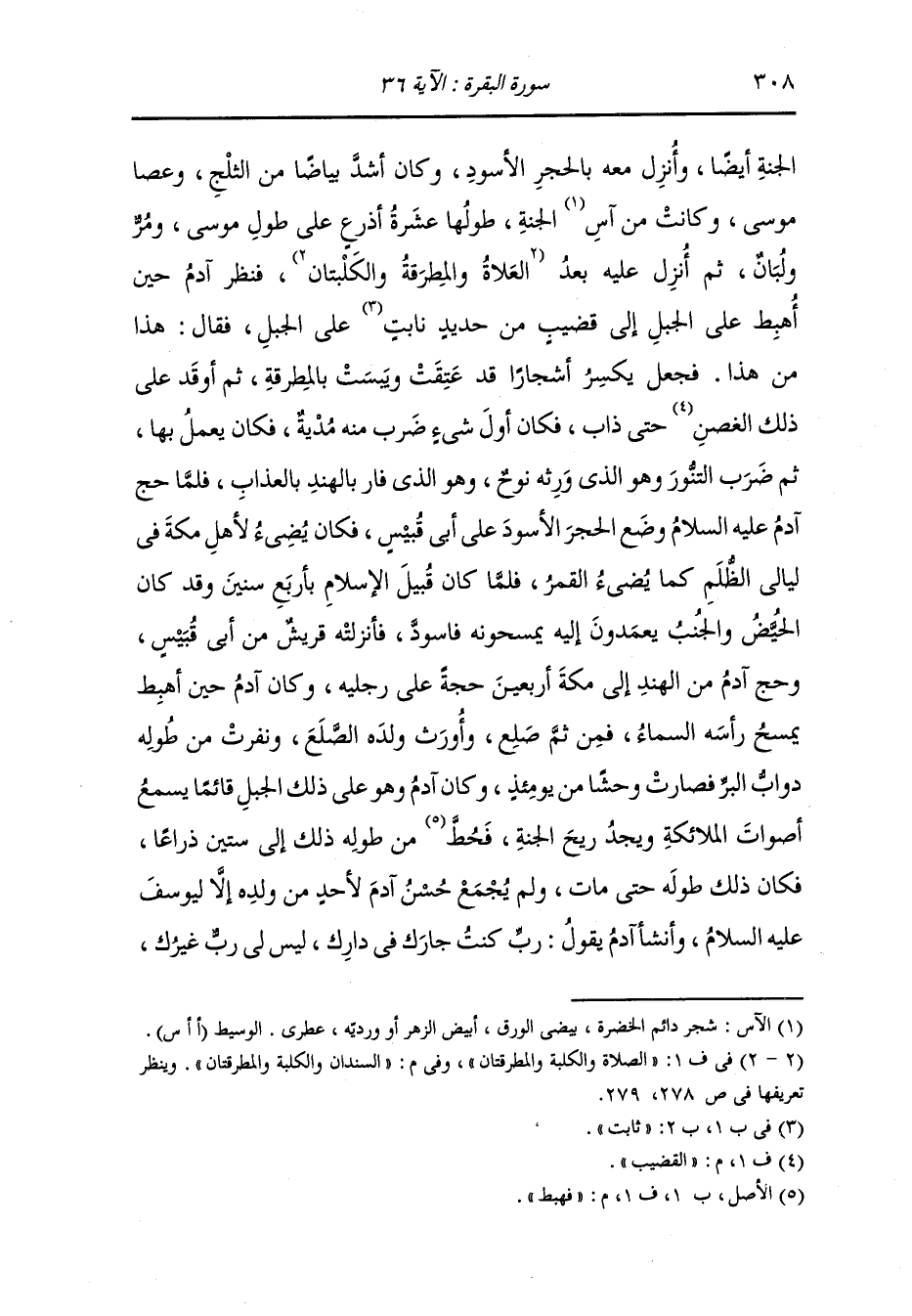 ولا رقيب دونك آكل فيها رغدا واسكن حيث أحببت فأهبطتني إلى هذا الجبل المقدس فكنت أسمع أصوات الملائكة وأراهم كيف يحفون بعرشك وأجد ريح الجنة وطيبها ، ثم أهبطتني إلى الأرض وحططتني إلى ستين ذراعا فقد انقطع عني الصوت والنظر وذهب عني ريح الجنة فأجابه الله تبارك وتعالى : لمعصيتك يا آدم فعلت ذلك بك ، فلما رأى الله عري آدم وحواء أمره أن يذبح كبشا من الضأن من الثمانية الأزواج التي أنزل الله من الجنة فأخذ آدم كبشا وذبحه ثم أخذ صوفه فغزلته حواء ونسجته هو فنسج آدم جبة لنفسه وجعل لحواء درعا وخمارا فلبساه وقد كانا اجتمعا بجمع فسميت (جمعا وتعارفا بعرفة فسميت عرفة وبكيا عاى ما فاتهما مائة سنة ولم يأكلا ولم يشربا أربعين يوما ثم أكلا وشربا وهما يومئذ على نود الجبل الذي أهبط عليه آدم ولم يقرب حواء مائة سنة.