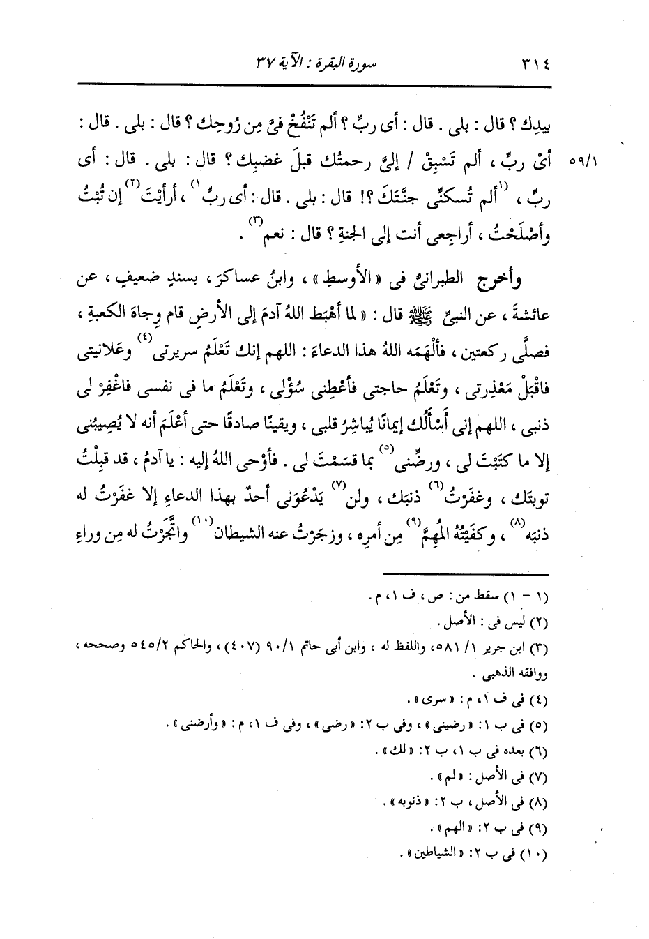 وأخرج الجندي والطبراني ، وَابن عساكر في فضائل مكة عن عائشة قالت : لما أراد الله أن يتوب على آدم أذن له فطاف بالبيت سبعا - والبيت يومئذ ربوة حمراء - فلما صلى ركعتين قام استقبل البيت وقال : اللهم إنك تعلم سريرتي وعلانيتي فاقبل معذرتي فأعطني سؤلي وتعلم ما في نفسي فاغفر لي ذنوبي ، اللهم إني أسألك إيمانا يباشر قلبي ويقينا صادقا حتى أعلم أنه لا يصيبني إلا ما كتبت لي والرضا بما قسمت لي ، فأوحى الله إليه : إني قد غفرت ذنبك ولن يأتي أحد من ذريتك يدعوني بمثل ما دعوتني إلا غفرت ذنوبه وكشفت غمومه وهمومه ونزعت الفقر من بين عينيه واتجرت له من وراء كل تاجر وجاءته الدنيا وهي راغمة وإن كان لا يريدها.