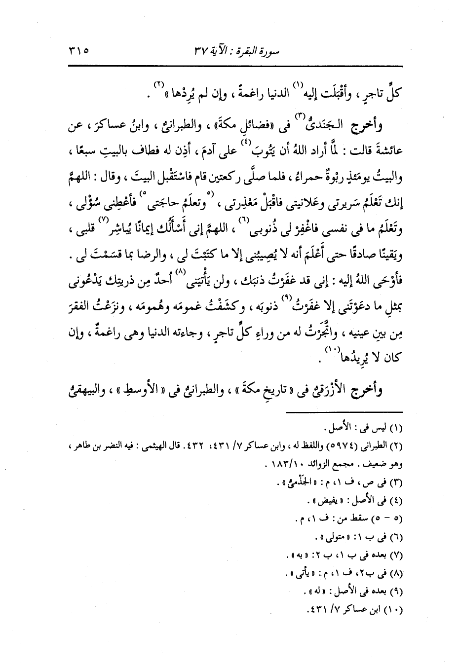 في الدعوات ، وَابن عساكر بسند لابأس به عن بريدة قال قال رسول الله صلى الله عليه وسلم : لما أهبط الله آدم إلى الأرض طاف بالبيت أسبوعا وصلى حذاء البيت ركعتين ثم قال : اللهم أنت تعلم سري وعلانيتي فاقبل معذرتي وتعلم حاجتي فأعطني سؤلي وتعلم ما عندي فاغفر لي ذنوبي ، أسألك إيمانا يباهي قلبي ويقينا صادقا حتى أعلم أنه لا يصيبني إلا ما كتيت لي ورضني بقضائك ، فأوحى الله إليه : يا آدم إنك دعوتني بدعاء فاستجبت