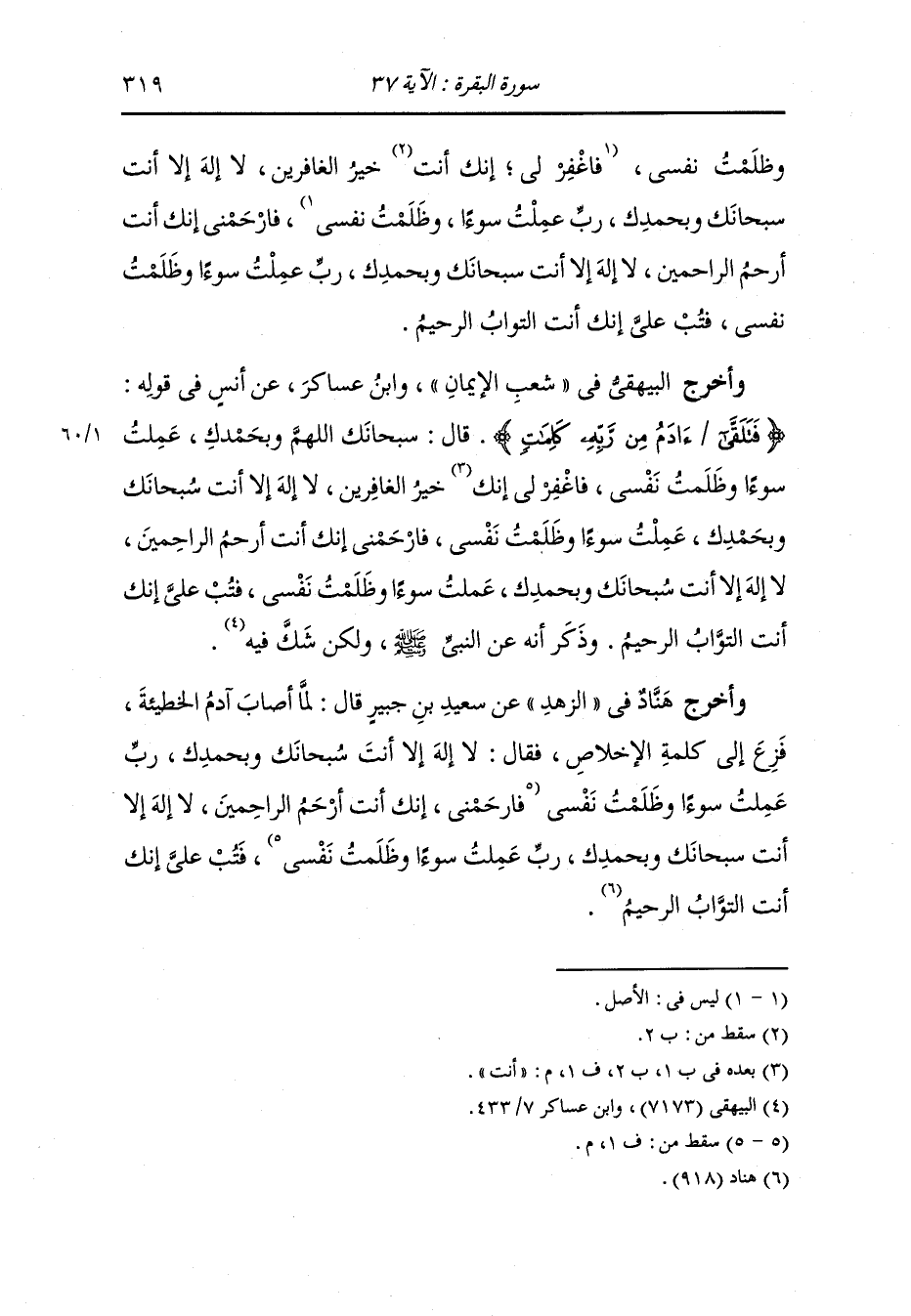 وأخرج ابن عساكر من طريق جويبر عن الضحاك عن ابن عباس ، إن آدم عليه السلام طلب التوبة مائتي سنة حتى آتاه الله الكلمات ولقنه إياها قال : بينا آدم عليه السلام جالس يبكي واضع راحته على جبينه إذا أتاه جبريل فسلم عليه فبكى آدم وبكى جبريل لبكائه فقال له : يا آدم ما هذه البلية التي أجحف بك بلاؤها وشقاؤها وما هذا البكاء قال : يا جبريل وكيف لا أبكي وقد حولني ربي من ملكوت السموات إلى هوان الأرض ومن دار المقام إلى دار الظعن والزوال ومن دار النعمة إلى دار البؤس والشقاء ومن دار الخلد إلى دار الفناء كيف أحصي يا جبريل هذه المصيبة فانطلق جبريل إلى ربه فأخبره بقالة آدم فقال الله عز وجل : انطلق يا جبريل إلى آدم فقل : يا آدم ألم أخلقك بيدي قال : بلى يا رب قال : ألم أنفخ فيك من روحي قال : بلى يا رب قال : ألم أسجد لك ملائكتي