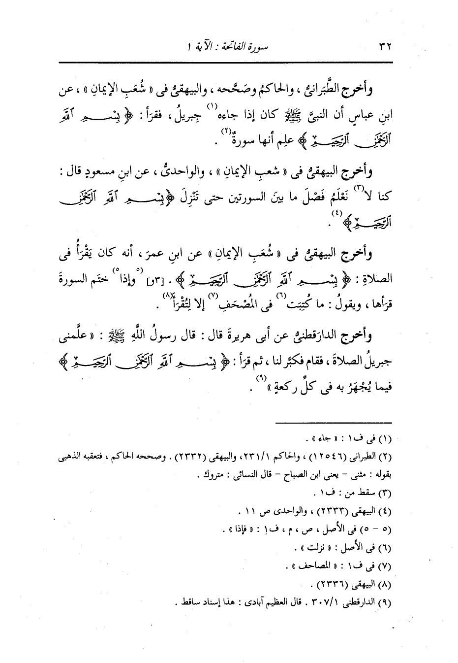 وأخرج البيهقي في شعب الإيمان والواحدي عن ابن مسعود قال : كنا لانعلم فصل مابين السورتين حتى تنزل {بسم الله الرحمن الرحيم}.