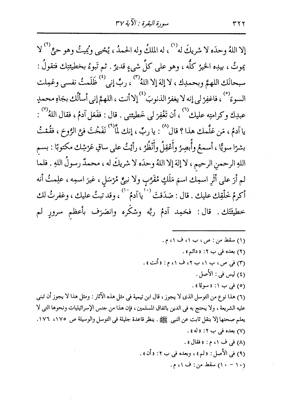 وأخرج الديلمي في مسند الفردوس بسند واه ، عَن عَلِي ، قال : سألت النَّبِيّ صلى الله عليه وسلم عن قول الله {فتلقى آدم من ربه كلمات فتاب عليه} فقال : إن الله أهبط آدم بالهند وحواء بجدة وإبليس ببيسان والحية بأصبهان ، وكان للحية قوائم كقوائم البعير ومكث آدم بالهند مائة سنة باكيا على خطيئته حتى بعث الله إليه جبريل وقال : يا آدم ألم أخلقك بيدي ألم أنفخ فيك من روحي ألم أسجد لك ملائكتي ألم أزوجك حواء أمتي قال : بلى ، قال : فما هذا البكاء قال : وما يمنعني من البكاء وقد أخرجت من جوار الرحمن قال : فعليك بهؤلاء الكلمات ، فإن الله قابل توبتك وغافر ذنبك ، قل : اللهم إني أسألك بحق محمد وآل محمد سبحانك لا إله إلا أنت عملت سوءا وظلمت نفسي فاغفر لي إنك أنت الغفور الرحيم ، اللهم إني أسألك بحق