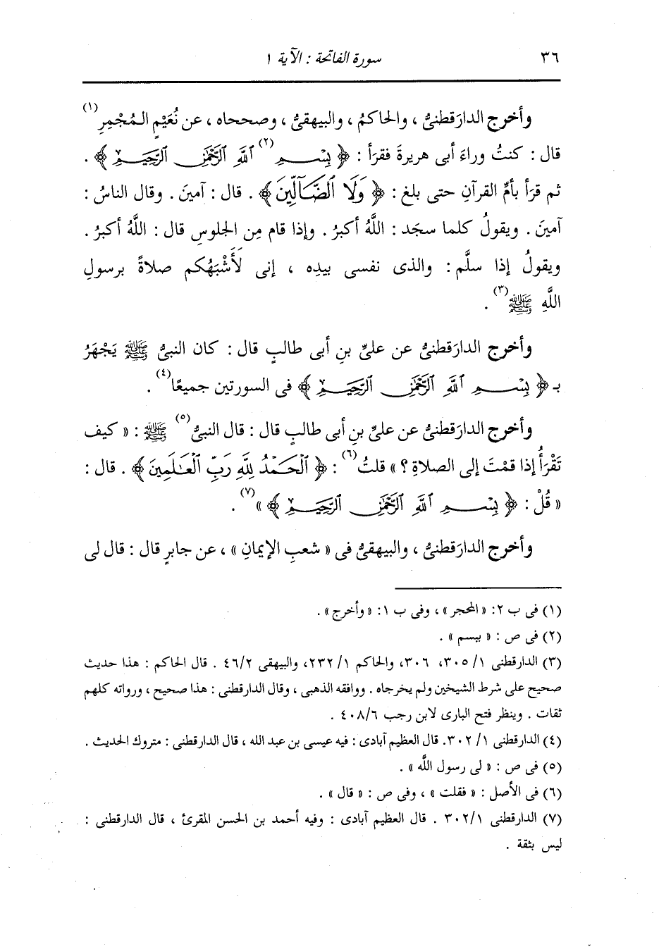 وأخرج الدارقطني عن علي بن أبي طالب قال : قال النَّبِيّ كيف تقرأ إذا قمت إلى الصلاة قلت {الحمد لله رب العالمين} قال : قل {بسم الله الرحمن الرحيم}.