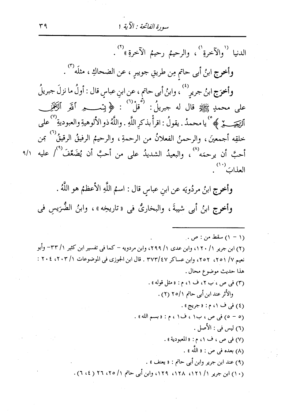وأخرج ابن جريج ، وَابن أبي حاتم عن ابن عباس قال أول ما نزل جبريل على محمد قال له جبريل {بسم الله} يا محمد ، يقول : اقرأ بذكر الله : و{الله} ذو الألوهية والمعبودية على خلقه أجمعين والرحمن الفعلان من الرحمة و{الرحيم} الرفيق الرقيق بمن أحب أن يرحمه والبعيد الشديد على من أحب أن يضعف عليه العذاب.