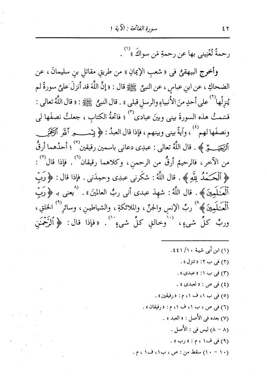 وأخرج البيهقي في شعب الإيمان من طريق ابن سليمان عن الضحاك عن ابن عباس عن النَّبِيّ صلى الله عليه وسلم قال إن الله أنزل علي سورة لم ينزلها على أحد من الأنبياء والرسل من قبلي ، قال النَّبِيّ صلى الله عليه وسلم : قال الله تعالى : قسمت هذه السورة بيني وبين عبادي فاتحة الكتاب جعلت نصفها لي : ونصفها لهم وآية بيني وبينهم فإذا قال العبد {بسم الله الرحمن الرحيم} قال الله : عبدي دعاني باسمين رقيقين ، أحدهما أرق من الآخر ، فالرحيم أرق من الرحمن ، وكلاهما رقيقان فإذا قال {الحمد لله} قال الله : شكرني عبدني وحمدني ، فإذا قال {رب العالمين} قال الله شهد عبدي أني رب العالمين ، رب الإنس والجن والملائكة والشياطين ورب الخلق ورب كل شيء فإذا قال {الرحمن