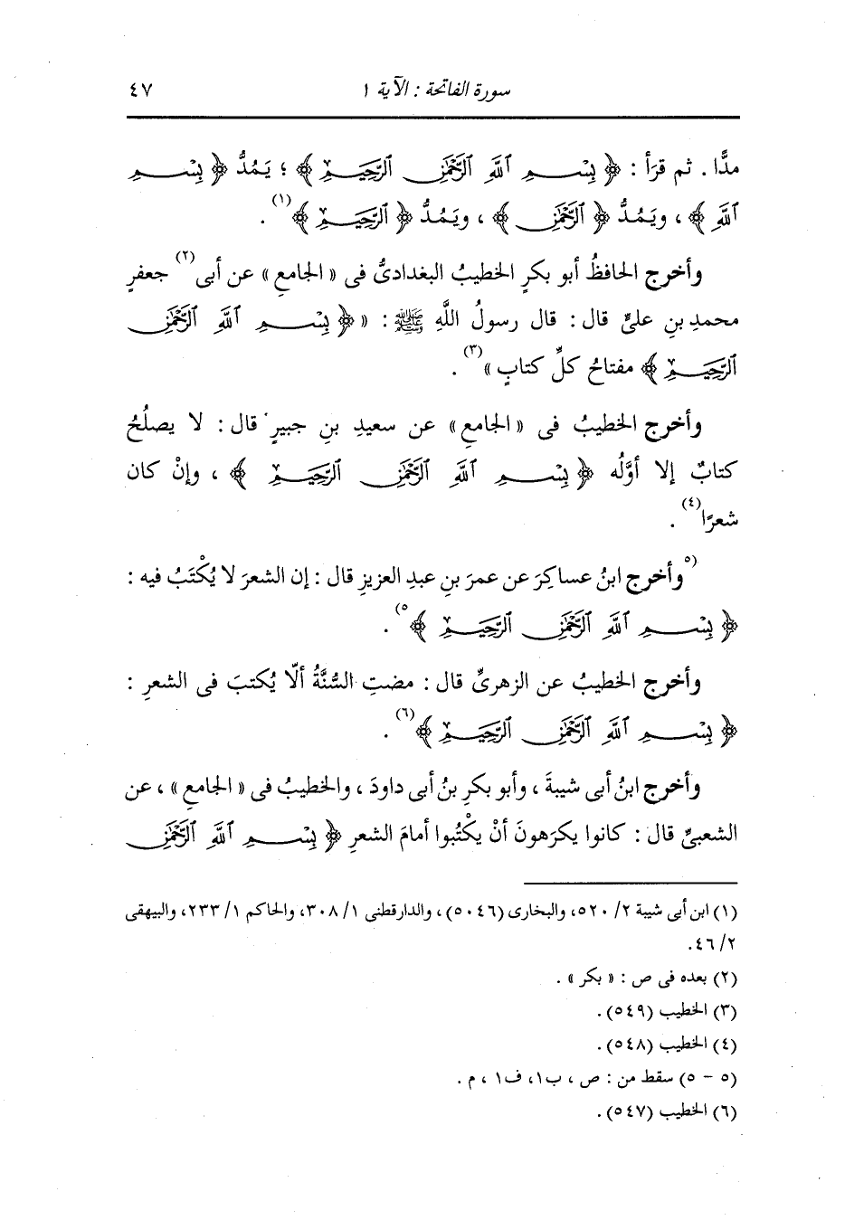 وأخرج الحافظ أبو بكر الخطيب البغدادي في الجامع عن أبي جعفر محمد بن علي قال قال رسول الله صلى الله عليه وسلم {بسم الله الرحمن الرحيم} مفتاح كل كتاب.