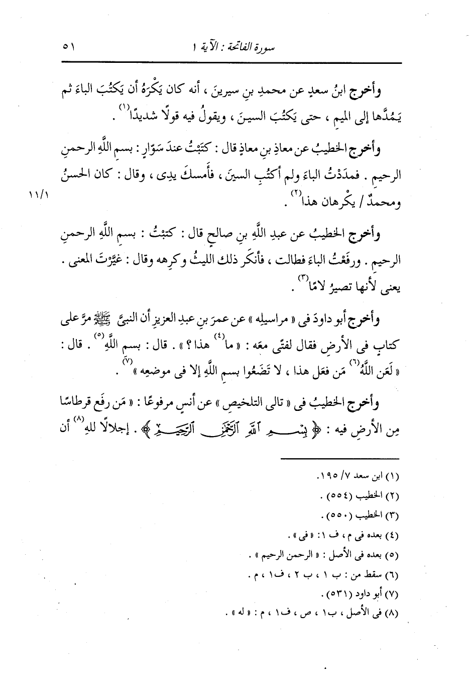وأخرج الخطيب عن معاذ بن معاذ قال : كتبت عند سوار {بسم الله الرحمن الرحيم} فممدت الباء ولم أكتب السين فأمسك يدي وقال : كان محمد والحسن يكرهان هذا.