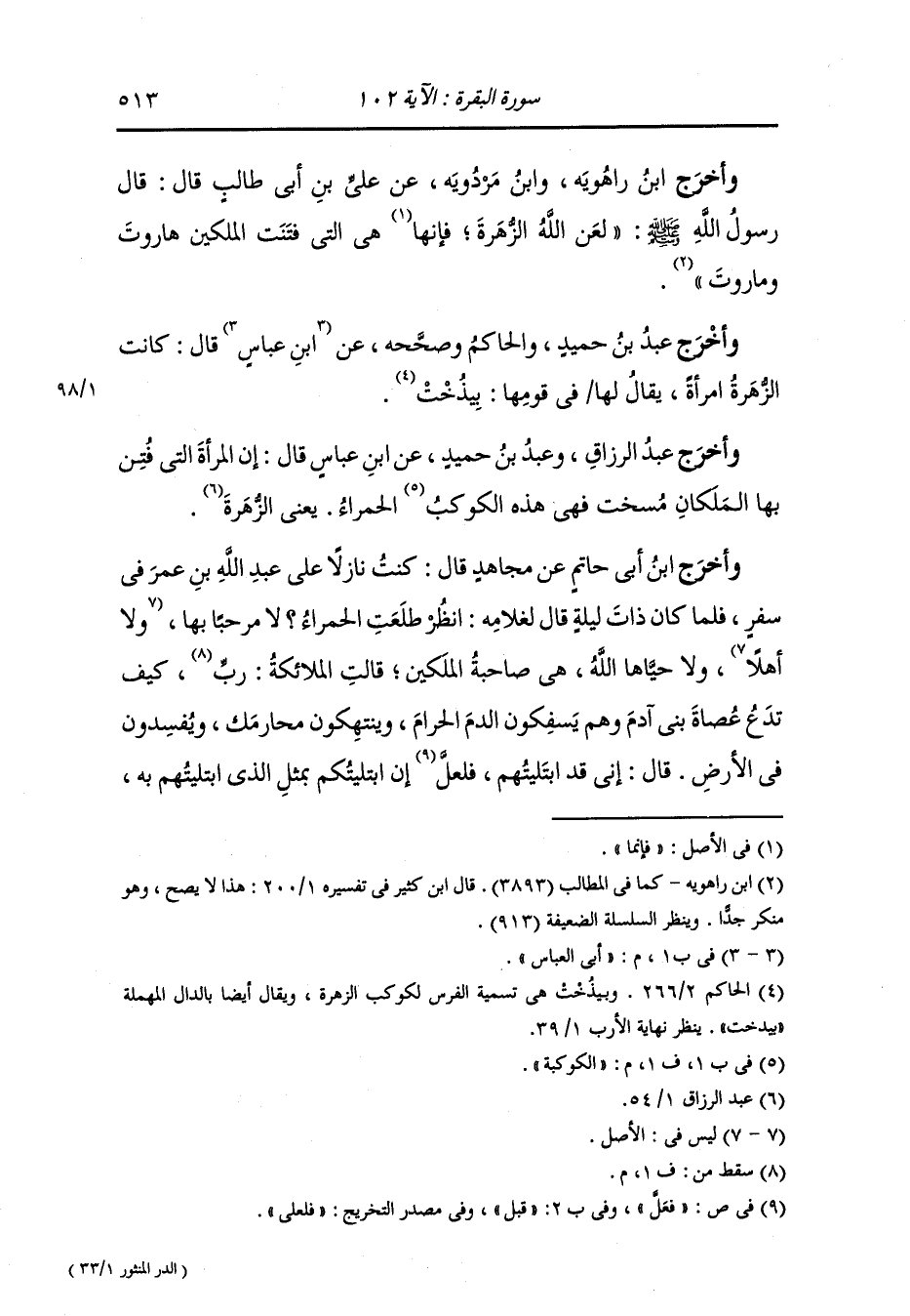 فعلتم كالذي يفعلون ، قالوا : لا ، قال : فاختاروا من خياركم اثنين ، فاختاروا هاروت وماروت فقال لهما : إني مهبطكما إلى الأرض ومعاهد إليكما أن لا تشركا ولا تزنيا ولا تخونا ، فأهبطا إلى الأرض وألقى عليهما الشبق وأهبطت لهما الزهرة في أحسن صورة امرأة فتعرضت لهما فأراداها عن نفسها فقالت : إني على دين لا يصلح لأحد أن يأتيني إلا من كان على مثله ، قالا : وما دينك قالت : المجوسية ، قالا : أنشرك هذا شيء لا نقر به ، فمكثت عنهما ما شاء الله ثم تعرضت لهما فأراداها عن نفسها فقالت : ما شئتما غير أن لي زوجا وأنا أكره أن يطلع على هذا مني فافتضح وإن أقررتما لي بديني