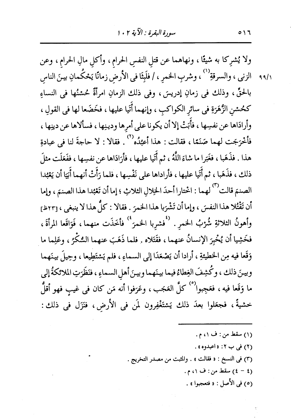 (والملائكة يسبحون بحمد ربهم ويستغفرون لمن في الأرض) (الشورى الآية 5) ، فقيل لهما : اختارا عذاب الدنيا أو عذاب الآخرة فقالا : أما عذاب الدنيا فإنه ينقطع ويذهب وأما عذاب الآخرة فلا انقطاع له فاختارا عذاب الدنيا فجعلا ببابل فهما يعذبان.